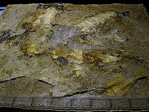 Šo trīspirkstainās pēdas nospiedumu, kura garums un platums ir 50 cm, atstājis visai liels, plēsīgs, uz divām kājām staigājošs dzīvnieks no Theropoda grupas. Smilšakmens plāksne ar pēdas nospiedumu nākusi no Obernkirhenes karjera Lejassaksijā (Vācijā), kas atrodas Vēzeres upes ielejā. Šajās akmeņlauztuvēs 2007. gadā atklāti slāņi ar vairākiem tūkstošiem zauru pēdu, ko ieminuši pārstāvji no šādām dinozauru grupām: Ankylosauria, Iguanodon, Stenopelix, Euornithopoda, Ornithischia, Theropoda. Nospiedumu vecums ir ap 140 miljoniem gadu un tie datējami ar krīta perioda sākumu. Plāksni muzejam dāvinājusi ģeoloģe Sarmīte Kondratjeva 2000. gadā.