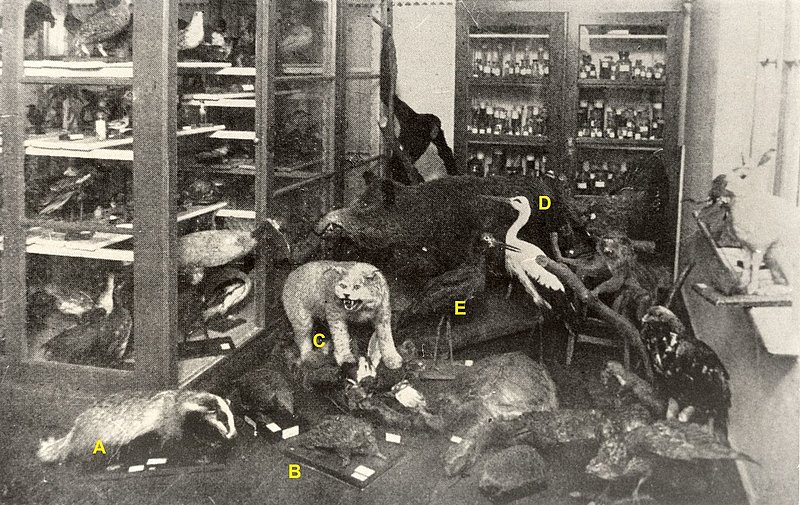 Zooloģijas muzeja zīdītājdzīvnieku ekspozīcijā izstādītais āpsis (Meles meles) [A] ir redzams nezināma autora uzņemtā fotogrāfijā kopā ar saviem “laikabiedriem”, no kuriem daudzus atpazīstam, tai skaitā lūsi [C] (nopirkts 20.03.1922, prof. N. Lebedinskis, LU Salīdzinošās anatomijas institūts), Austrālijas ehidnu [B] saņemta 30.05.1927 no Hasfordas skolas kolekcijas), melno stārķi [E] (saņemts 20.01.1941 no Kurzemes provinces muzeja), meža cūku [D] (Latvijas valsts pirmā prezidenta J.Čakstes 20.04.1922 dāvinājums).
