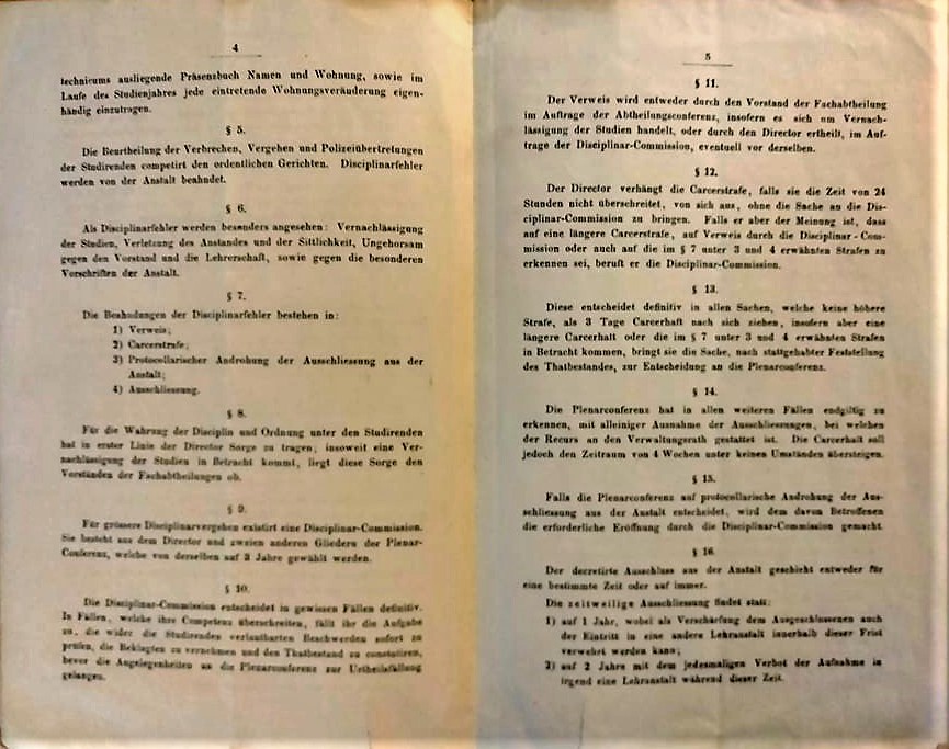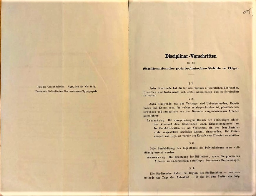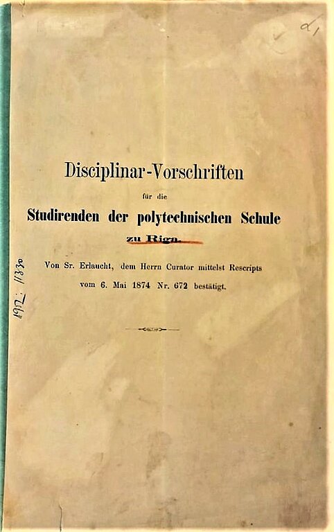 [1] LUM4120. Disciplinar-Vorschrift für die Studierenden der polytechnischen Schule zu Riga, Seite 2-3; 7