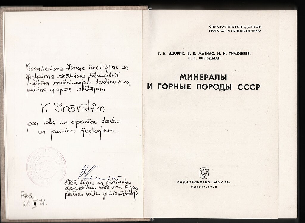 Dreimanis A., Liepiņš P. (red. V. Zāns) 1942. Latvijas minerāli un ieži. Universitāte Rīgā, mācību grāmatu sērija, Nr. 26. Universitātes apgāds, Rīga, 312 lpp.