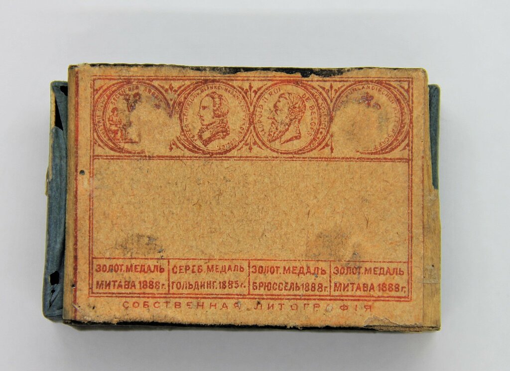 Lai tabaku varētu smēķēt, bija nepieciešami sērkociņi, ar ko smēķi aizdedzināt. Vienīgā Studentu karcerī atrastā sērkociņu kastīte ir ražota A/S “Vulkāns” [17], kas ir viena no zināmākajām sērkociņu rūpnīcām Latvijas vēsturē, tāpēc tās atrašana nav sevišķi pārsteidzoša. Sērkociņu rūpnīcu “Vulkāns” 1878.g. Kuldīgā dibināja vācbaltietis Luijs Hiršmans. Sākotnēji produkcija tika ražota 6 darbiniekiem strādājot bez rūpnīcas iekārtām, taču tas bija viens no pirmajiem šāda veida uzņēmumiem Krievijas impērijā un ātri sāka attīstīties. 4 gadus vēlāk uzņēmums pārcēlās uz jaunām ražošanas telpām un biznesu izvērsa arvien plašāk [18]. Ar laiku tika ierīkots arī tvaika dzinējs, kā arī L. Hiršmans patentēja sērkociņu kastītīšu veidus, ā arī ražoja sērkociņu ražošanas mašīnas. Kopš 1886.g., pirmo reizi Krievijas impērijā, uzsāka ražot sērkociņus ar sarkanām un dzeltenām galviņām. Drīz vien uzņēmums eksportēja preces uz ārzemēm, piemēram, Ķīnu, Japānu, Afganistānu, Rietumeiropu u.c. “Vulkāns” kļuva par lielāko sērkociņu ražotāju Krievijas impērijā [19]. Lai arī šāds atradums nav unikāls retums Latvijas muzejos, tas ir vērā ņemams laikmeta liecinieks.