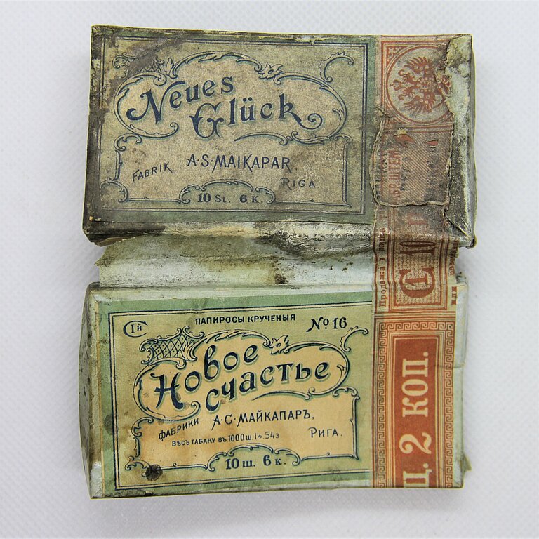 Nākamā Maikapar papirosu kastīte ir saglabājusies krietni pilnvērtīgāk – gan vāks, gan kastīte pilnā apjomā turas kopā [10]. To rotā dekoratīvi florālie elementi, kas raksturīgi baroka stilam un uz vāka virspusē rakstīts teksts krievu valodā “Новое счастье” – Jaunā laime. Pārējais teksts arī ir krievu valodā, aprakstīta ražotāja rūpnīca un produkta nosaukums. Otrā pusē, kas ir krietni vairāk noputējusi, redzams tāds pats dizains un apraksts vācu valodā “Neues Glück”, kas iezīmē laikmeta valodu dualitāti Latvijas teritorijā. Uz iepakojumu kastītēm nebija teksta latviešu valodā – toreiz pilsētnieku sarunvaloda bija vācu un ierēdniecībā runāja krieviski. Arī Rīgas Politehnikumā mācības notika vācu valodā, līdz 1887.g. sākās pāreja mācībām uz krievu valodu, kas tika pilnvērtīgi relizēta līdz 1896.g. Tas notika Krievijas impērijas pārkrievošanas politikas ietvaros (pāreja nenotika uzreiz, jo tehnisko zinātņu specifikas dēļ, nebija iespējams uzreiz piesaistīt mācībspēkus, kas tajās specializējas) [11]. Latviešu valodai bija ļoti neliela loma tā laika inteliģences un pilsētnieku dzīvē, tāpēc arī uz tirdzniecības precēm tā netika lietota.