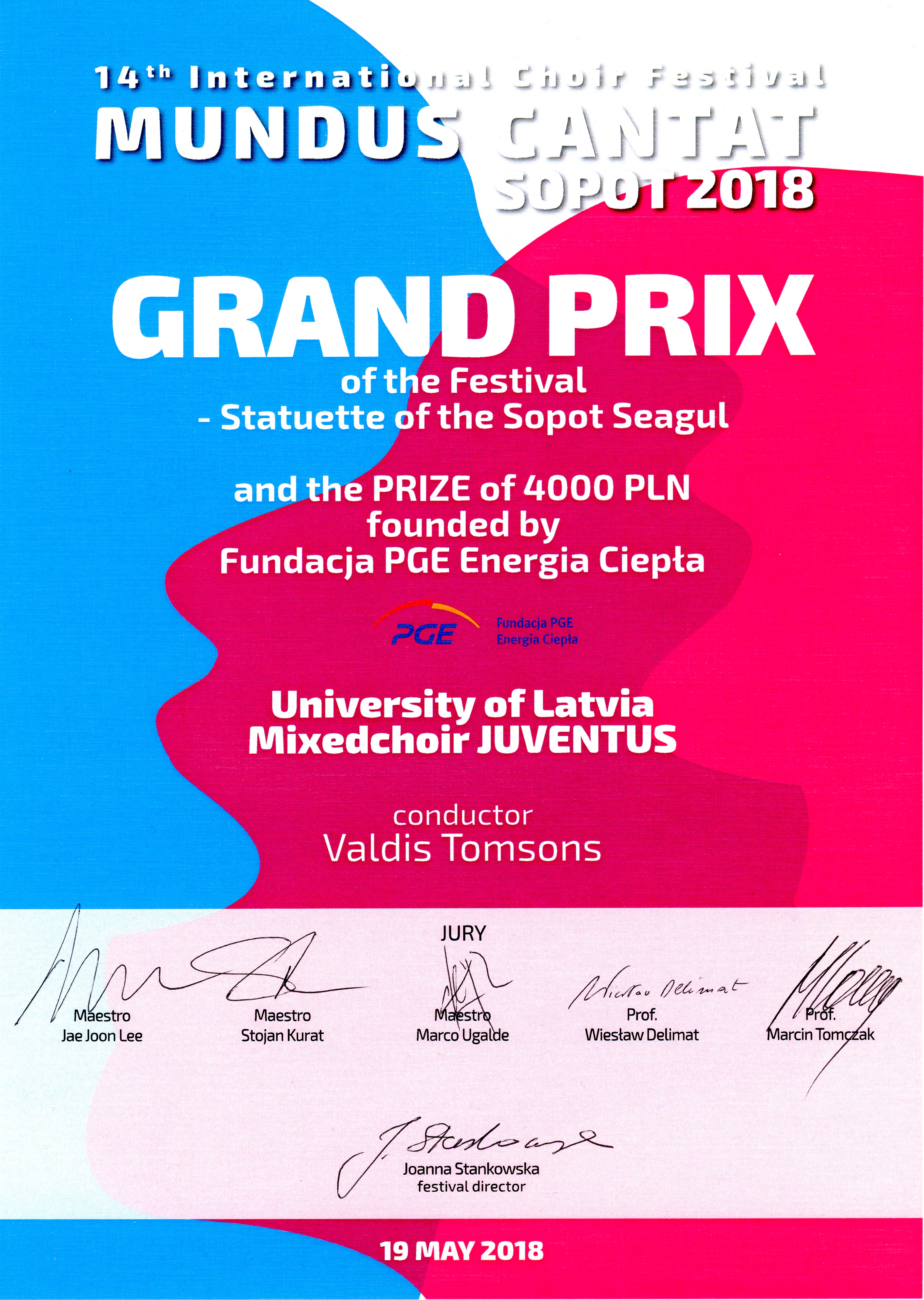 “Juventus” guvis ievērojamus panākumus starptautiskajos koru konkursos. 1992. gadā - Grand Prix Nīrpeltas (Beļģija) starptautiskajā jauniešu koru konkursā, 1997. gadā - Grand Prix II Starptautiskajā koru konkursā Šjenā (Norvēģija), 2011. gadā – Grand Prix konkursā “Sudraba zvani” Daugavpilī, 2017. gadā – Grand Prix un 1. vieta jaukto koru grupā 53. Starptautiskajā koru festivālā Montrē (Šveice), 2018. gadā – Grand Prix un 1. vieta jaukto koru grupā konkursā “Mundus Cantat 2018” Sopotā (Polijā), 2025. gadā Grand Prix Tamperes Vokālās mūzikas festivālā (Somija) u.c.