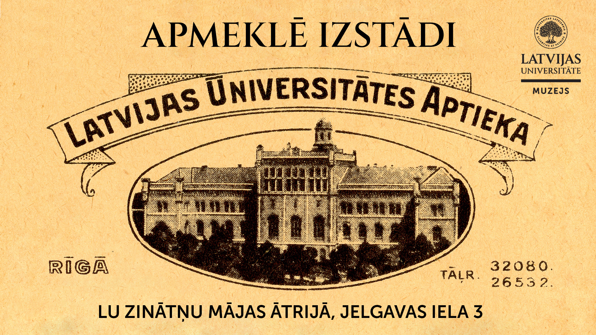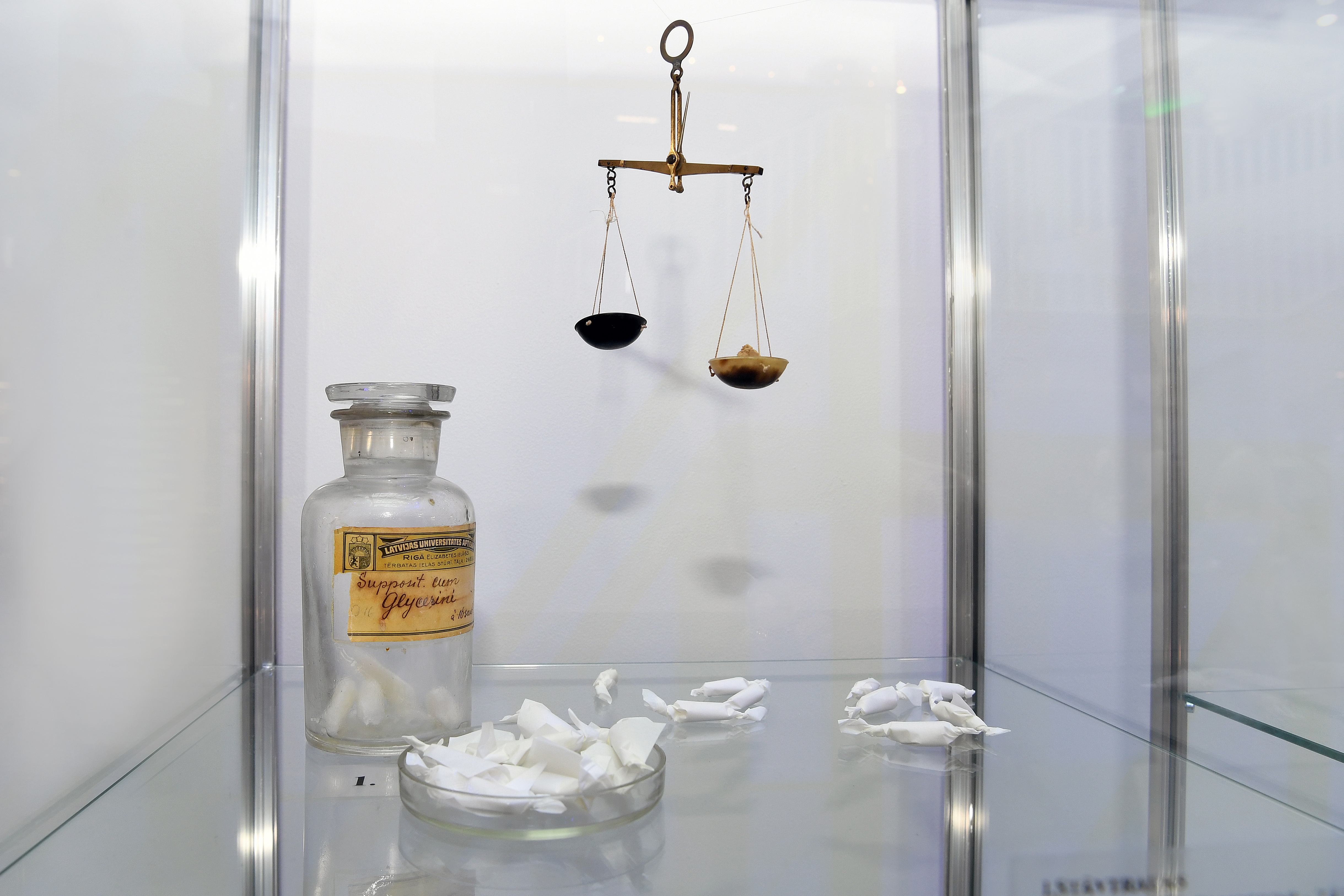 Latvijas Universitātes (LU) Akadēmiskā centra Zinātņu mājā Torņakalnā, Jelgavas ielā 3, ātrijā apskatāma izstāde “Latvijas Universitātes aptieka”.