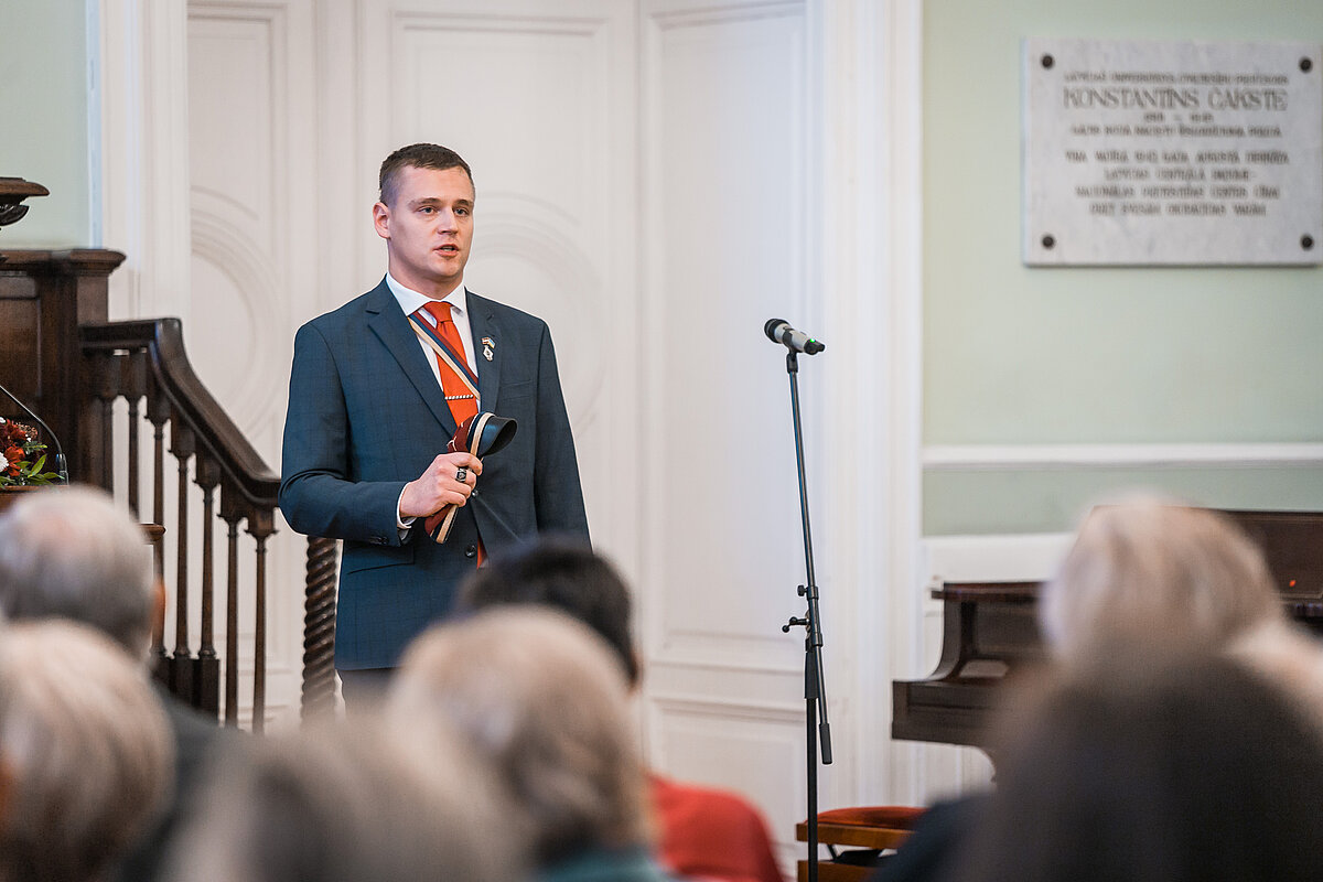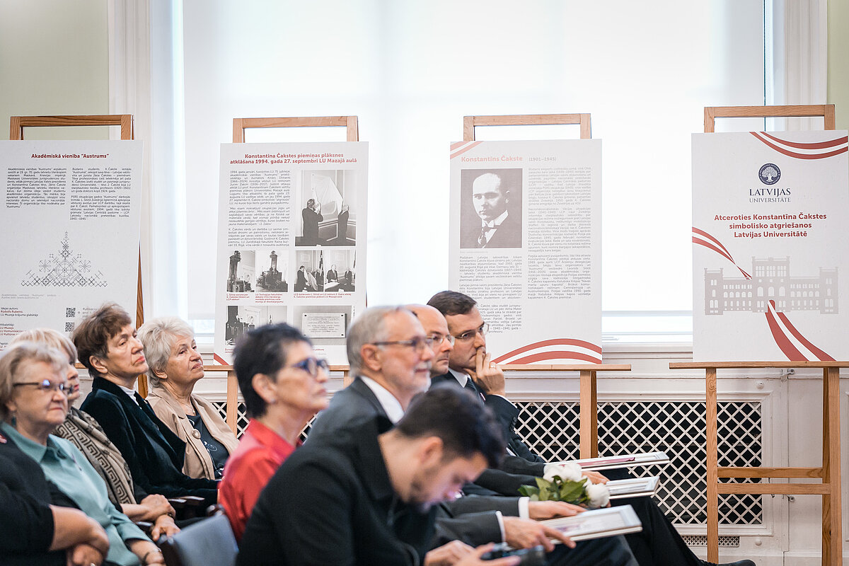 Pirms 30 gadiem (1994. gada 27. septembrī) Latvijas Universitātes (LU) Mazajā aulā atklāja LU civiltiesību profesora un Latvijas Centrālās padomes (LCP) priekšsēdētāja Konstantīna Čakstes piemiņas plāksni, kas aizsāka viņa piemiņas kopšanu LU kopš Latvijas valsts neatkarības atjaunošanas. LU Muzejs kopš 2020. gada veicis pētniecisko darbu par profesora piemiņas kopšanas aizsākumiem LU, vērtējot piemiņas plāksni (tās formu un saturu) kā vienu no ekskursiju apskates objektiem un piemiņas plāksnes atklāšanas vēstures avotus LU Muzeja krājumā. Šogad, atzīmējot Latvijas Republikas 106. gadskārtu, LU Mazajā aulā š. g. 15. novembrī notika valsts svētkiem veltīts svinīgais pasākums, kurā godināja Latvijas un LU simboliskās vērtības. Līdzās LU heraldiskā ģerboņa atklāšanai un LU Juridiskās fakultātes docenta Jāņa Plepa priekšlasījumam par K. Čaksti, LU Muzejs atklāja izstādi "Atceroties Konstantīna Čakstes simbolisko atgriešanos Latvijas Universitātē", balstoties uz pētnieciskā darba rezultātiem un LU Muzeja krājumā pieejamajām fotogrāfijām par profesora atgriešanos Latvijā un LU. Pasākumā piedalījās LU Muzeja, vadības, fakultāšu, Senioru kluba pārstāvji, kā arī studenšu korporāciju "Daugaviete", "Dzintra" un "Zinta" pārstāves.