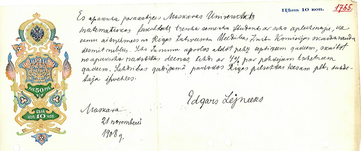 Pirms braukšanas uz Maskavu, Pētera I reālskolas skolotājs Pavļinovs E. Lejniekam iedevis vēstuli adresētu Maskavas Universitātes prof. Volkovam. Ar vēstules palīdzību E. Lejnieks tika uzņemts Maskavas Universitātes Matemātikas fakultātē [5] kā brīvklausītājs, ar noteikumu, ka gada laikā nokārtos eksāmenu latīņu valodā. Latīņu valodas eksāmenu viņš nokārtoja, bet latīņu valoda E. Lejniekam tā arī palikusi kā visnemīlētākais priekšmets. Lai sevi materiāli nodrošinātu un palīdzētu mātei, paralēli mācībām E. Lejnieks strādāja par mājskolotāju turīgā krievu ģimenē, kā arī saņēmis 10 rubļu aizņēmumu no Rīgas Latviešu biedrības Zinību komisijas (4.att.). Maskavas Universitāti E. Lejnieks pabeidza pēc 4 gadiem, 1911.gadā 22 gadu vecumā (5.att.).