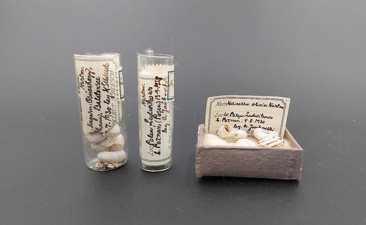 Baltie vīngliemeži glabāšanās kastē. Čaulas: no LU Muzeja krājuma.