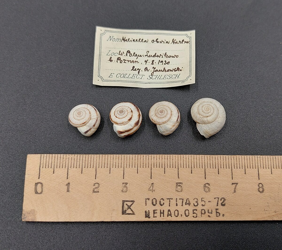 Pārpratumu raisa etiķetes no šis kolekcijas. Pie latīņu nosaukuma parasti norāda nosaukuma autora vārdu. Šajā gadījuma tam vajadzētu būt Menke, bet uz etiķetēm norādīts Johans Daniels Vilhelms Hartmanis (Johann Daniel Wilhelm Hartmann, 1793 - 1862). Sajaukums par gliemju nosaukuma autorību radies vēsturisko taksonomijas (sugu noteikšana, klasifikācija, nosaukumu piešķiršana) prakses īpatnību un zinātniskās nosaukumu piešķiršanas konvenciju attīstības dēļ. Kā jau minēts, pirmoreiz sugu aprakstīja Kārlis Menke 1828. gadā. J. Hartmanis vēlāk šo sugu pārklasificēja un iekļāva Helicella ģintī ap 1842. gadu[5]. Neskaidrības radās vairāku iemeslu dēl. Vēsturiskās autoru norādes bija nekonsekventas un Hartmaņa klasifikācija kļuva populāra. Tikai 1975. g. pārpratumu atrisināja un K. Menke kļuva par sugas klasifikācijas latīniskā vārda autoru.