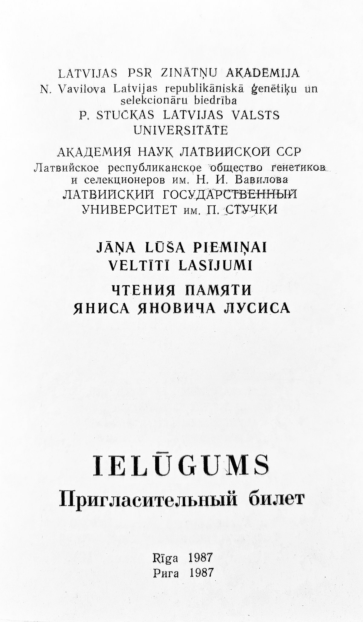 Pārskatot dokumentu arhīvu, tika atrasts 1987. gada “Ielūgums” uz Jāņa Lūša piemiņai veltītajiem lasījumiem Latvijas Universitātē. Profesors Lūsis bija un arī paliek viens no nozīmīgākajiem 20. gadsimta zinātniekiem, kas atstājis savas pēdas Latvijas zinātnes vēsturē.