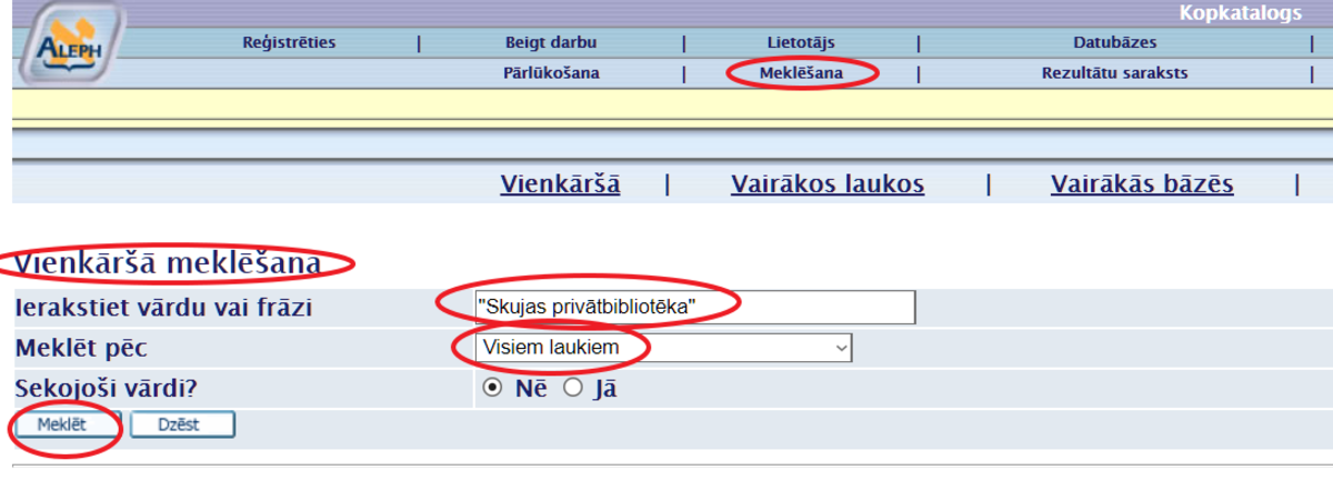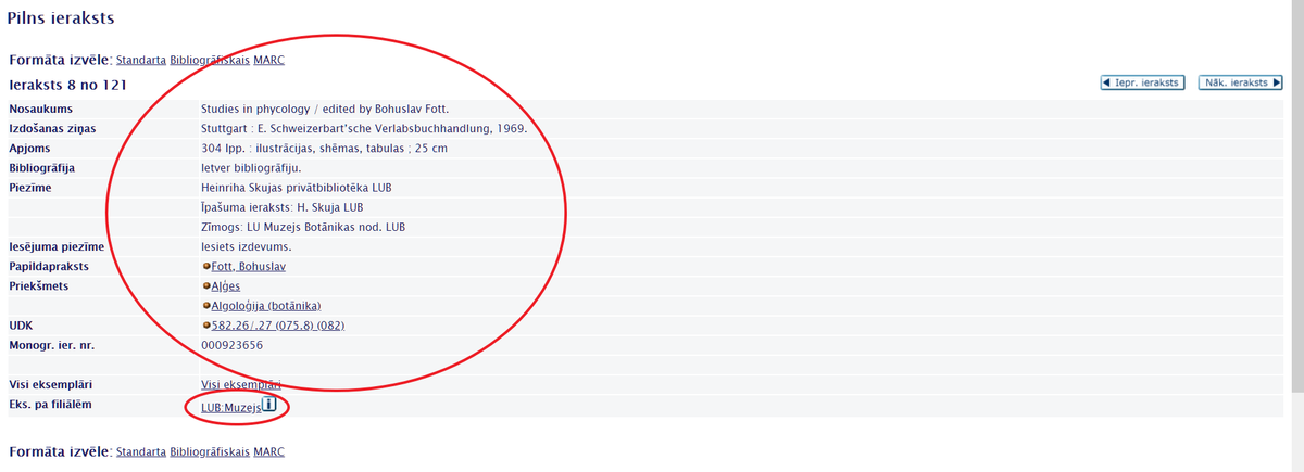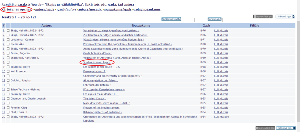 Lai iepazītos ar krājumā esošo monogrāfiju uzskaitījumu, LU Muzejs aicina izmantot Valsts nozīmes bibliotēku elektronisko kopkatalogu, meklēšanas logā ierakstot frāzi “Skujas privātbibliotēka”, izvēloties meklēt pēc Visiem laukiem un spiežot pogu Meklēt (skat. 2. att.). Iegūtos rezultātus var kārtot pēc dažādiem parametriem (skat. 3. att.). Spiežot uz izvēlētās monogrāfijas nosaukuma, var aplūkot informāciju par autoru, izdevēju, izdošanas gadu, apjomu, tematisko priekšmetu u. c. informāciju (skat. 4. att.). Ja izvēlētajai monogrāfijai Eks. pa filiālēm atrodas LUB:Muzejs, tad tā ir apskatāma muzeja Botānikas un mikoloģijas kolekcijās Kronvalda bulvārī 4, 122. telpā, iepriekš piesakot apmeklējumu kolekcijas krājuma glabātājai Daigai Jamontei pa e-pastu daiga.jamonte@lu.lv. Monogrāfijas apskatāmas uz vietas, uz mājām netiek izsniegtas. Ir pieejams skenēšanas pakalpojums.