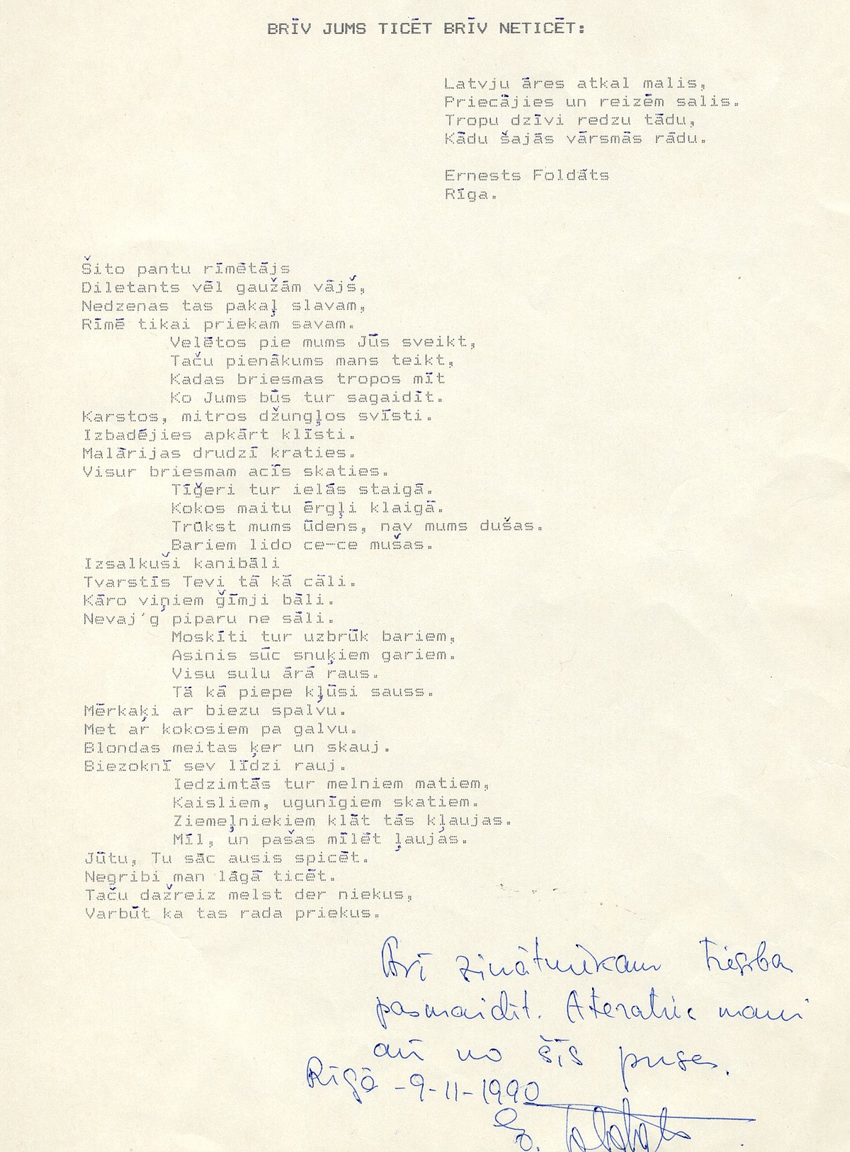 Šo dzejoli Ernests Foldāts sarakstījis Rīgā, 1990. gada 9. novembrī un papildinājis ar parakstu: “Arī zinātniekam tiesība pasmaidīt. Atceries mani arī no šīs puses.” LU Muzejs mudina savus apmeklētājus, interesentus, zinātnes un vēstures entuziastus, LU darbiniekus, studentus, un arī visus citus, attīstīties daudzos dažādos virzienos, būt gan nopietniem dzīves pētniekiem, gan jautriem māksliniekiem, gan centīgiem sportistiem. Būt jebkam, kas vien Jums ienāk prātā, un pilnā sparā izbaudīt dzīvi un visas tās sniegtās iespējas, kā to darīja Ernests Foldāts.