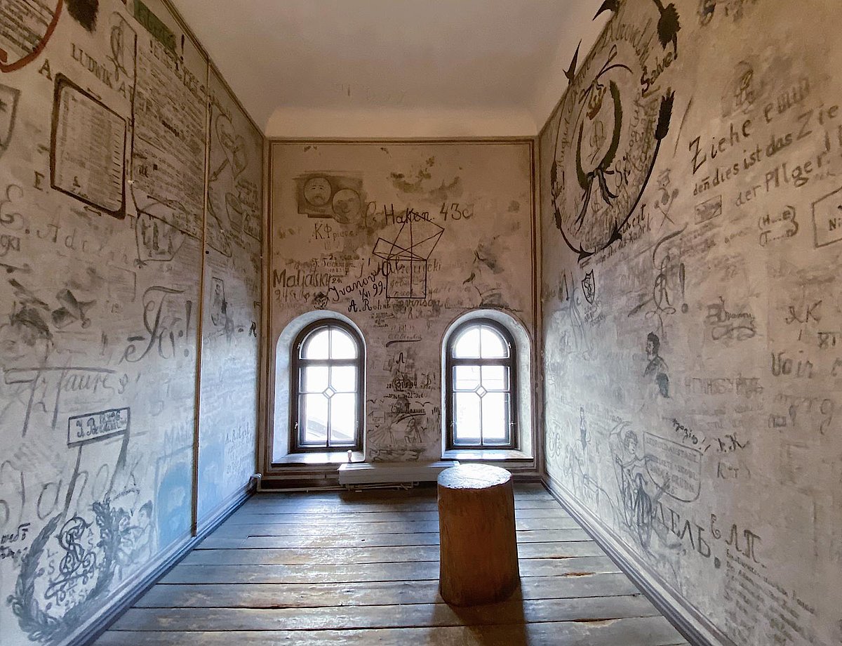Uzraugi pret ieslodzītajiem studentiem bija ļoti stingri. Par to liecina uz karcera sienām atstātās studentu vēsturiskās liecības. Uz viena no tiem redzama karikatūra – uzraugs, kas pakārts karātuvēs, turpat redzama saulīte un uzraksts „Da hängt die alte Schpurhund” jeb „Tur karājas vecais suņpurns”. Uz aprakstītajām sienām glabājās arī citas unikālas vēsturiskas liecības – studentu zīmējumi, uzraksti latviešu, poļu, vācu, krievu, franču un latīņu valodās, joki, matemātikas formulas, pārdomas par augstskolas pasniedzējiem un atmiņas par mīļotajām meitenēm.