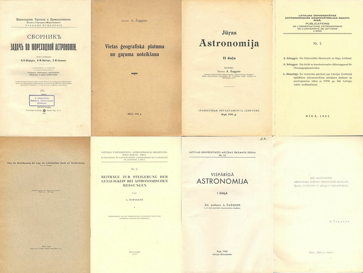 1937. A. Schagger. Beiträge zur Steigerung der Genauigkeit bei astronomischen Messungen (Papildinājumi astronomisko novērojumu precizitātes palielināšanai). Latvijas Ūniversitātes Astronomiskās observātōrijas raksti. Nr. 3. Helsinki, 1937.