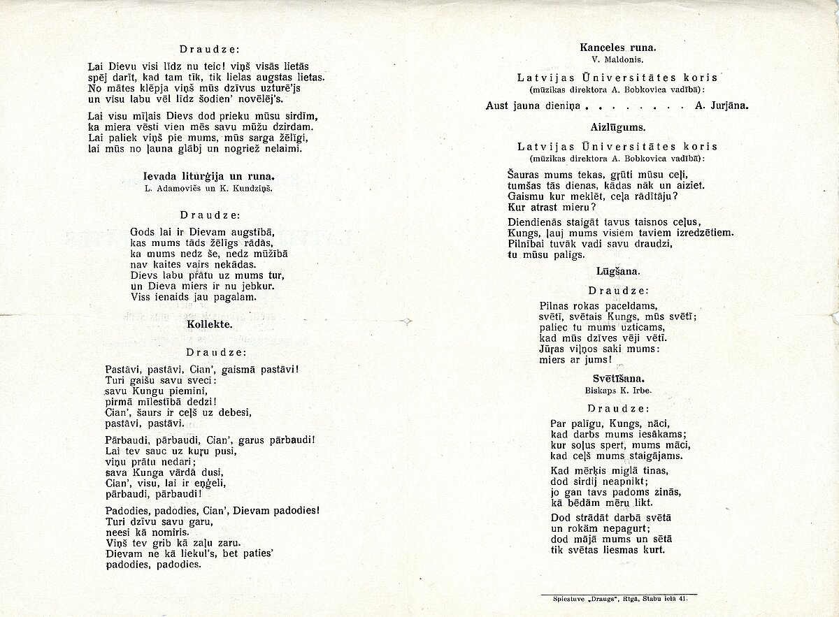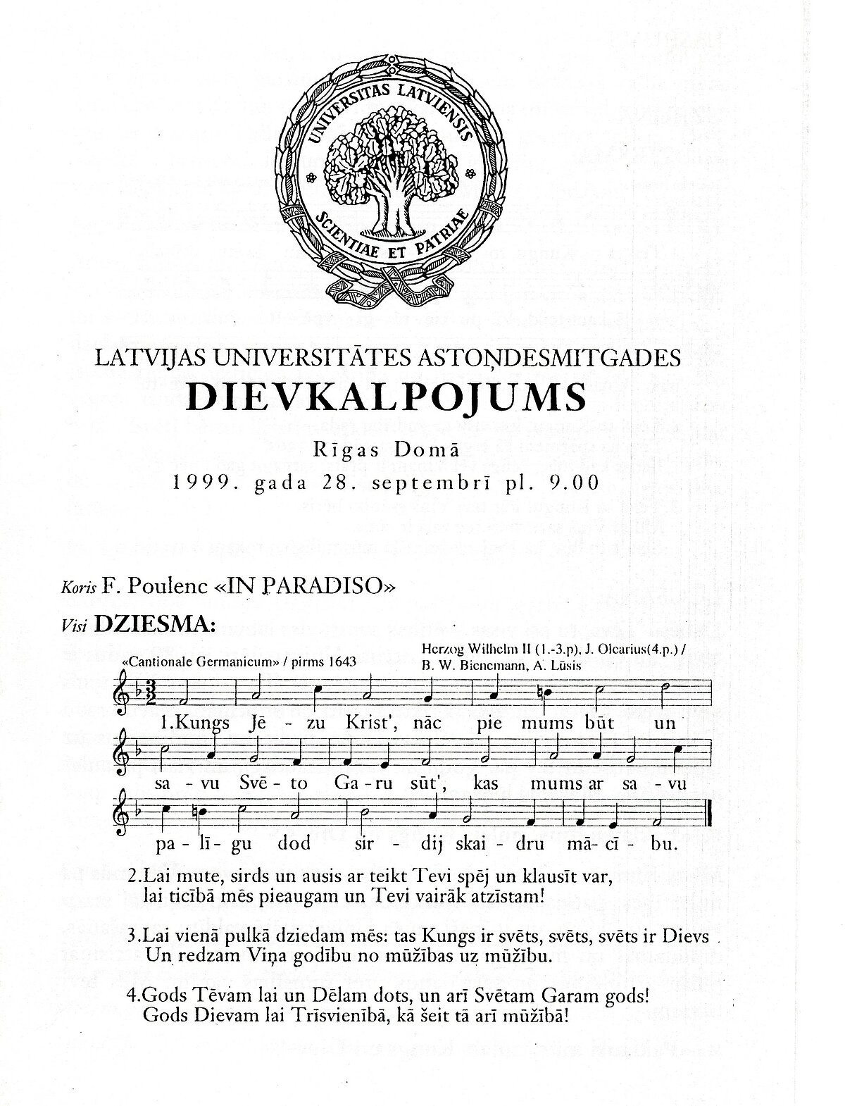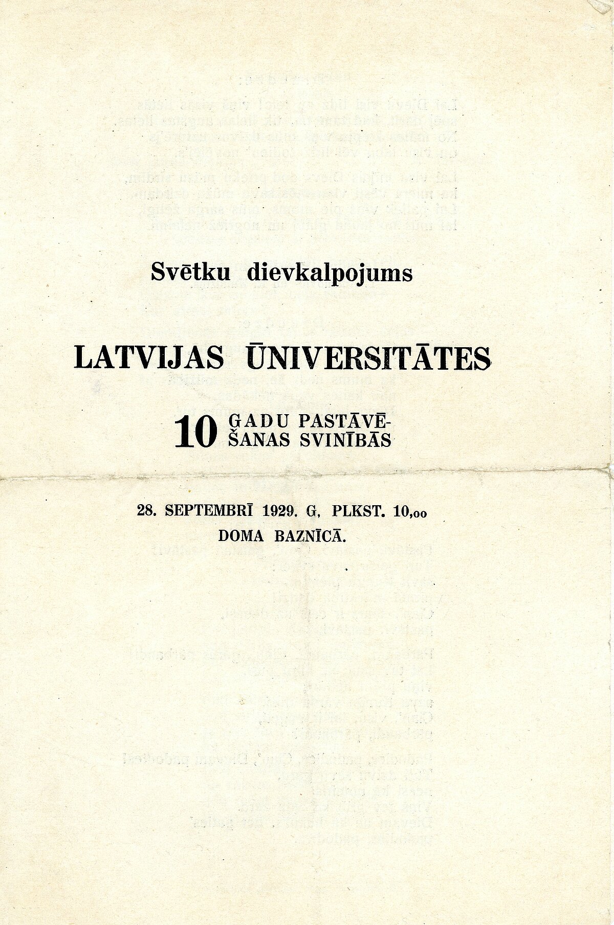 Latvijas Universitātes (LU) Muzeja krājums glabā atmiņas par vienu no tradīcijām Alma Mater – Latvijas Universitātes dibināšanas svētku dievkalpojumu programmas. Kopumā saglabājušās sešas – piecas no starpkaru perioda (1918-1940) un viena no Latvijas Universitātes astoņdesmit gadu jubilejas 1999. gadā. Visi svētbrīži notikuši Doma baznīcā, kas ir arī Latvijas arhibīskapa katedrāle.