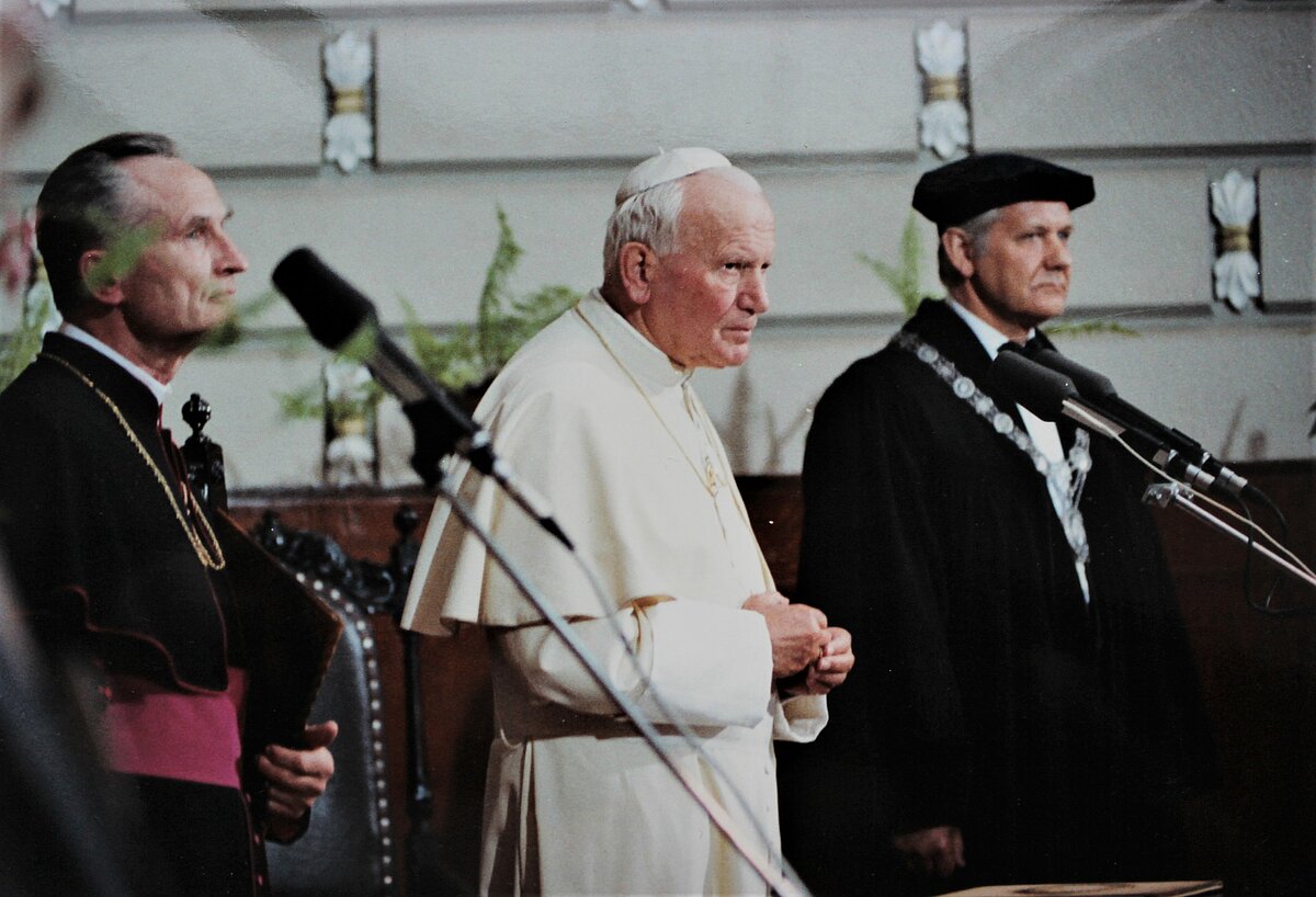 Pāvests Jānis Pāvils II Latvijas Universitātē tikās ar studentiem un mācībspēkiem, kā arī ar citiem Latvijas inteliģences pārstāvjiem: “Tuvojoties Latvijas apmeklējuma noslēgumam, priecājos tikties ar jums – akadēmiskās un kultūras pasaules pārstāvjiem. Šī pasaule man ir īpaši dārga, jo esmu bijis ar to cieši saistīts un šo saikni glabāju joprojām. Tāpēc šeit, Rīgas Alma Mater, jūtos kā mājās, it īpaši pēc tik pagodinošas un sirsnīgas uzņemšanas, kādu jūs man veltījāt.”[2] Pāvests pats bija studējis un ieguvis doktora grādu filozofijā par tēmu “Ticības problēmas Sv. Jāņa no Krusta [3] darbos”. Disertāciju pāvests aizstāvējis esot priestera kārtā 1948. gadā Romā.