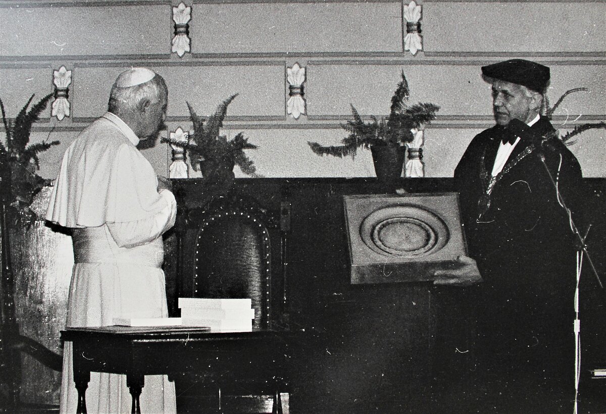 Latvijas Universitātes Muzejā glabājas liecības par plaši pazīstamu cilvēku vizītēm Alma Mater, tomēr jāizceļ kāds īpašs apmeklējums, ar ko lepojas ne tikai Muzejs, bet visa plašā Universitātes saime. 1993. gadā vizītē uz Baltijas valstīm devās Romas katoļu baznīcas pāvests Jānis Pāvils II, viena no nozīmīgākajām 20. gadsimta personībām. Latvijā viņš uzkavējās divas dienas – no 8. līdz 10. septembrim. Savas vizītes laikā pāvests apmeklēja Rīgas Domu un Svētā Jēkaba katedrāli Rīgā, Aglonas Vissvētākās Jaunavas Marijas debesīs uzņemšanas Romas katoļu baziliku, kā arī Latvijas Universitāti (LU), kurā pāvests viesojās 9. septembrī. [1] No pāvesta uzņemšanas Universitātē saglabājušās vairākas liecības – pasākuma fotogrāfijas, kā arī pāvesta dāvinājumi Universitātei – piemiņas medaļu komplekts un grāmatas ar pāvesta vēstulēm bīskapiem.
