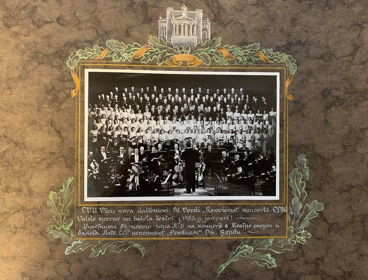 Muzeja krājumā esošais albums sniedz vizuālu informāciju par LVU vīru kora darbību no tā pirmsākumiem 1948. gadā. Fotogrāfijās īpaši izcelti koncertizbraukumi gan Baltijas valstīs, gan ārpus tām; kora dibinātāji un diriģenti, un dažādas citas kora vēstures nianses. Fotogrāfijās attēlota kora koncertdarbība arī pēc LVU vīru kora likvidēšanas 1959. gadā un kad daļa koristu pievienojas Rīgas Politehniskā institūta (tagad Rīgas Tehniskā Universitāte) korim, un izveidojās vīru koris “Gaudeamus”. Tā kā fotogrāfijas albumā ir sakārtotas hronoloģiski un visām ir apraksti, šis albums uzskatāms par ļoti vērtīgu LVU vīru kora vēstures liecību un avotu.