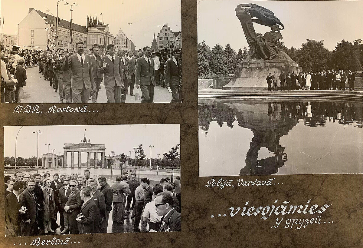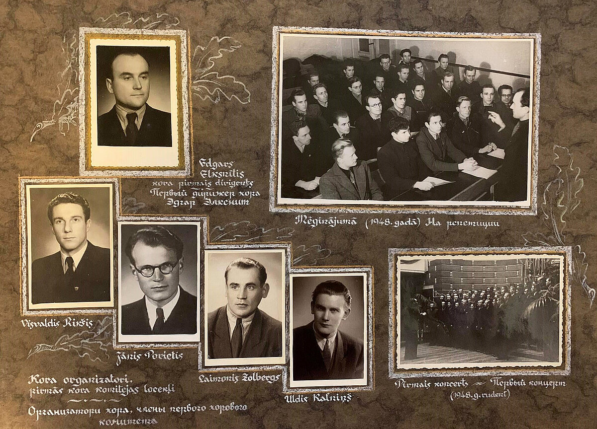 Albuma sākumā redzamas fotogrāfijas ar kora vadītājiem – diriģentu Haraldu Medni (1906-2000) un kora koncertmeistari Maiju Saivu (1924-2006). Tāpat apskatāma fotogrāfija ar Latvijas PSR Nopelniem bagāto skatuves mākslinieku, LPSR Valsts operas un baleta teātra (tagad Latvijas Nacionālā opera un balets) solistu Pēteri Grāveli (1919-1995), ar kuru kopā aizvadīti vairāki koncerti, kuros P. Grāvelis uzstājies kā solists.
