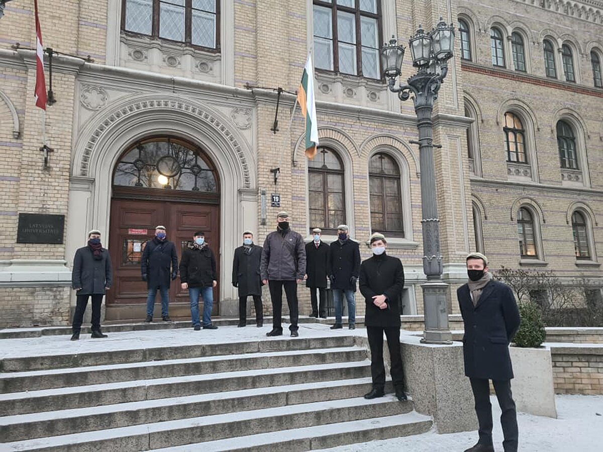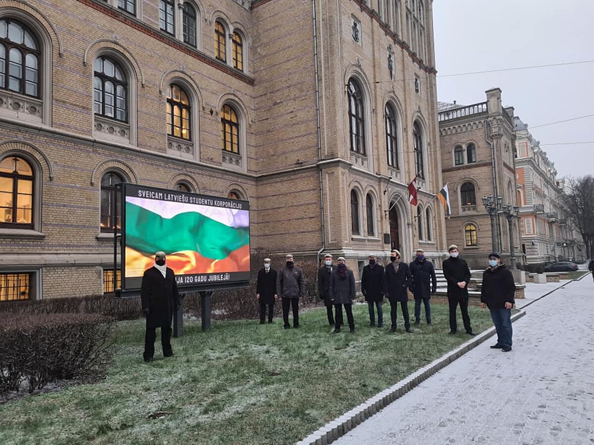 2020. gada 14. decembrī latviešu studentu korporācija Talavija atzīmēja savu 120. gadskārtu, paceļot savu balt-zaļ-zelta krāsas karogu pie LU galvenās ēkas ieejas durvīm no Raiņa bulvāra 19 puses līdzās Latvijas sarkan-balt-sarkanajam karogam. Pirms 102 gadiem vietā, kur tika izkarināts Talavija karogs, Atsevišķās Studentu rotas karavīri no latviešu studentu korporācijas Selonija pacēla sarkan-balt-sarkanos Latvijas karogus. Abas latviešu studentu korporācijas veidoja kodolu vienam no pirmajiem Latvijas nacionālajiem militārajiem formējumiem – Atsevišķajai Studentu rotai. Virtuālā izstāde tapusi sadarbojoties latviešu studentu korporācijas Latvia loceklim Rūdolfam Rubenim un latviešu studentu korporācijas Talavija loceklim Marģeram Počam.