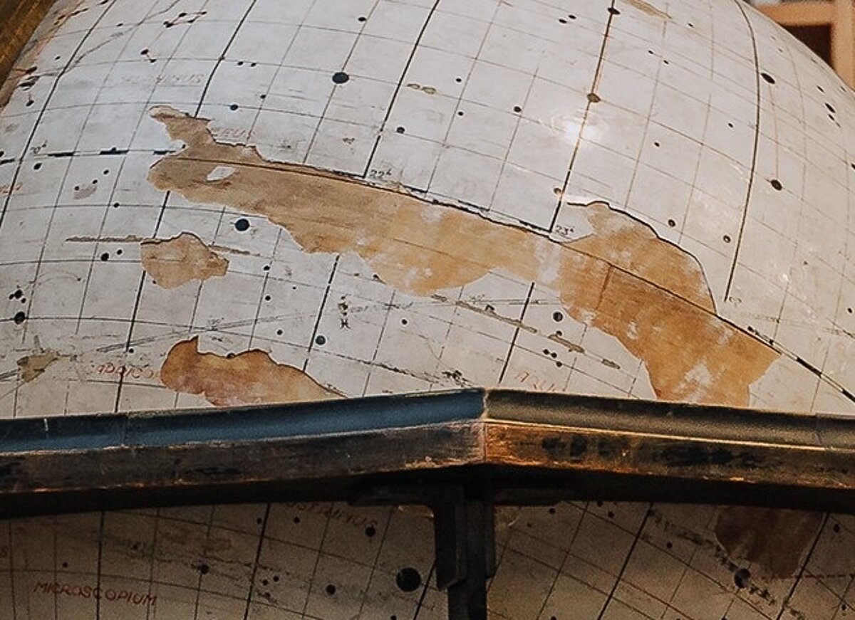 “Ilgstošās lietošanas gaitā no tā dažviet bija nolupis krāsojums ar zvaigžņu figūru elementiem. Astronomu telpu atbrīvošanas procesā globuss cieta vēl vairāk, un neatliekot to bija nepieciešams restaurēt. Tika pieaicināta polihromākoka restauratore Sarmīte Balode, kas novērtēja bojājumus un pētīja paša globusa uzbūvi.”