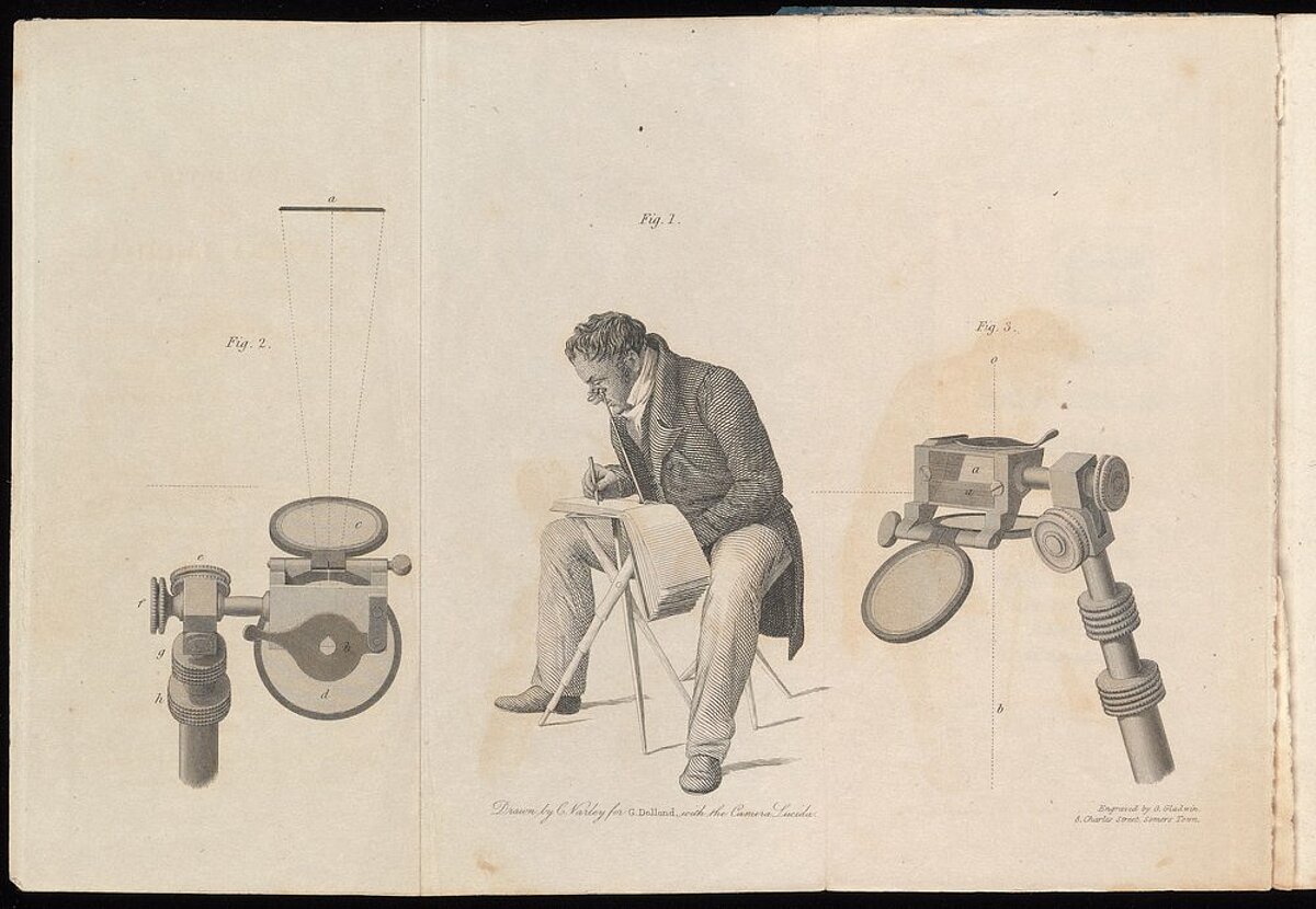 Dažus gadu desmitus pirms vēl tika izgudrota fotogrāfija, angļu ķīmiķis Sers Viljams Haids Volstons (Sir William Hyde Wollaston) zīmētgribētājiem un citiem apkārtredzamā atainotājiem lietošanā piedāvāja aparātu, kuru 1806. gadā patentēja kā “zīmēšanai perspektīvē vai attēla, zīmējuma kopēšanai pamazinātā formā”. Pats izgudrotājs 1807. gadā to pārsauca par Camera Lucida (pretēji Camera Obscura). Mazā, viegli pārnēsājamā un arī pieejamā optiskā ierīce tolaik sastāvēja no metāla kājas, kuru varēja piestiprināt pie zīmēšanas galda, un tai varēja mainīt augstumu, bet pie kājas bija piestiprināta stikla prizma un lēca skatīšanai.