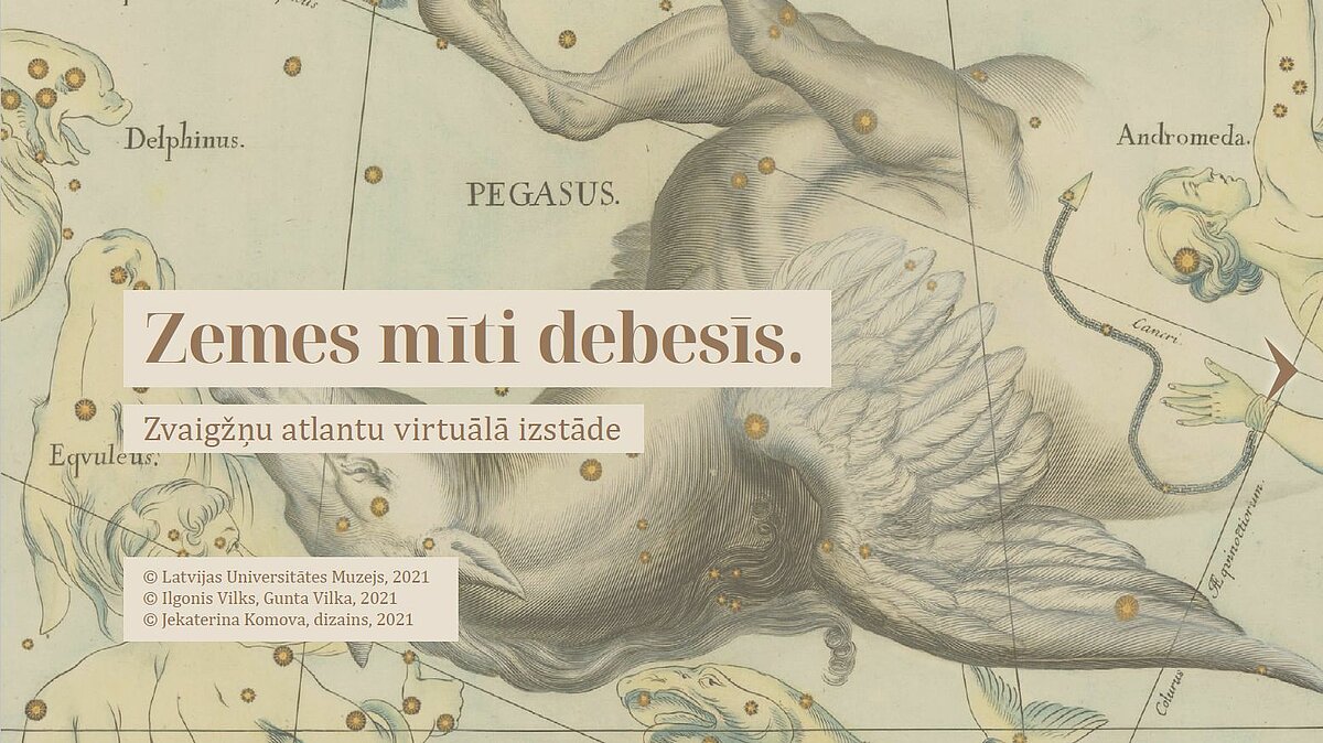 Kāpēc virtuālās izstādes nosaukumā minēti mīti? Daudzi zvaigznāju nosaukumi saistīti ar sengrieķu mītiem, kas vēsta par dievu un varoņu dzīvi, tāpēc var teikt, ka izstādē eksponētās zvaigžņu kartes atspoguļo arī Zemes mītus, kas pārcelti debesīs. Izstādē iespējams izlasīt interesantus faktus par katru atlantu un tā autoru, aplūkot zvaigznāju krāšņās mitoloģiskās figūras. Papildu materiālā var detalizēti „izšķirstīt” katru atlantu, iepazīties ar Latvijā labāk redzamajiem zvaigznājiem un izlasīt pašus mītus.