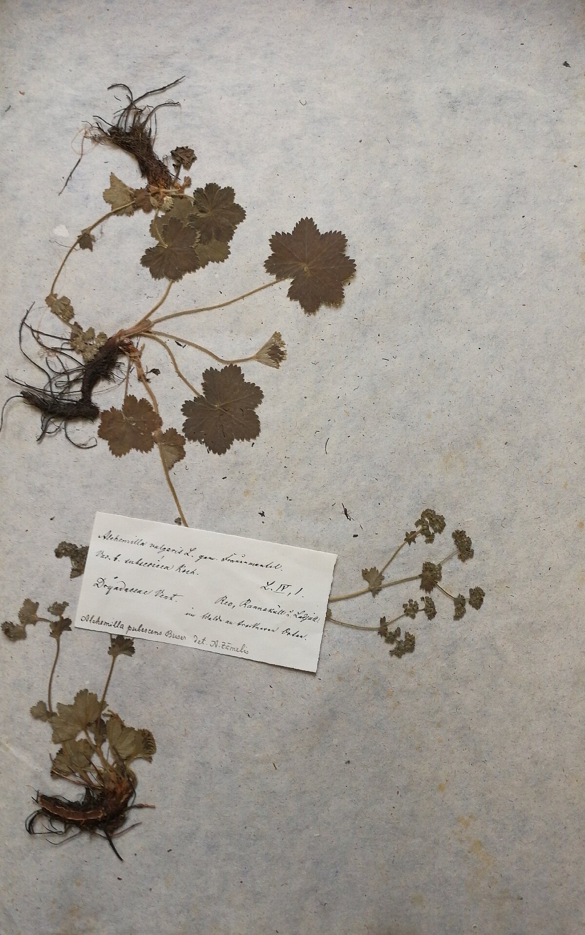 Vēl viens sadarbības piemērs ir raskrēsliņa Alchemilla paraugs, kura sugu precizējis latviešu botāniķis Aleksandrs Zāmels (1897-1943), kas veicis lielu ieguldījumu raskrēsliņu izpētē. Redzams, ka nosaukums un paraksts ir ar paša A. Zāmela roku rakstīts.