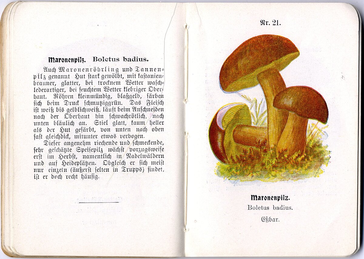 Katrai sugai aprakstīts to vizuālais izskats, tās smarža un garša, izplatītākais augšanas periods un vietas, nosauktas pēc izskata līdzīgas sugas, ar kurām to varētu sajaukt. Un jau iepriekš minētās kvalitatīvās ilustrācijas. Kopumā grāmatā ir 16. lappuses ar sērijas “Miniatur-Bibliothek” nosaukumiem, kas sakārtoti alfabētiskā kārtībā, 31. lappuse ar sēņu valsts raksturojumu un recepšu aprakstiem un 32 atvērumi ar konkrētu sugu aprakstiem un ilustrācijām. Grāmata iespiesta C. Grumbaha (C. Grumbach) drukātavā Leipcigā.