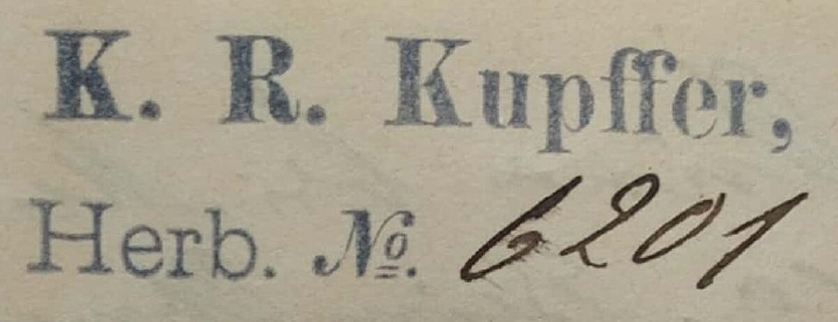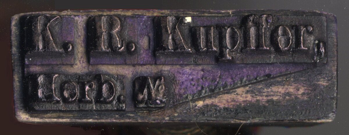 - Taisnstūra formas spiedogs ar uzrakstu “Determ. K. R. Kupffer, Riga, 19” ar tukšu vietu, kur precizēt gada skaitli. Determ. ir saīsinājums no latīņu vārda determinatio, kas nozīmē noteikšana, šajā gadījumā - auga sugas noteikšana.