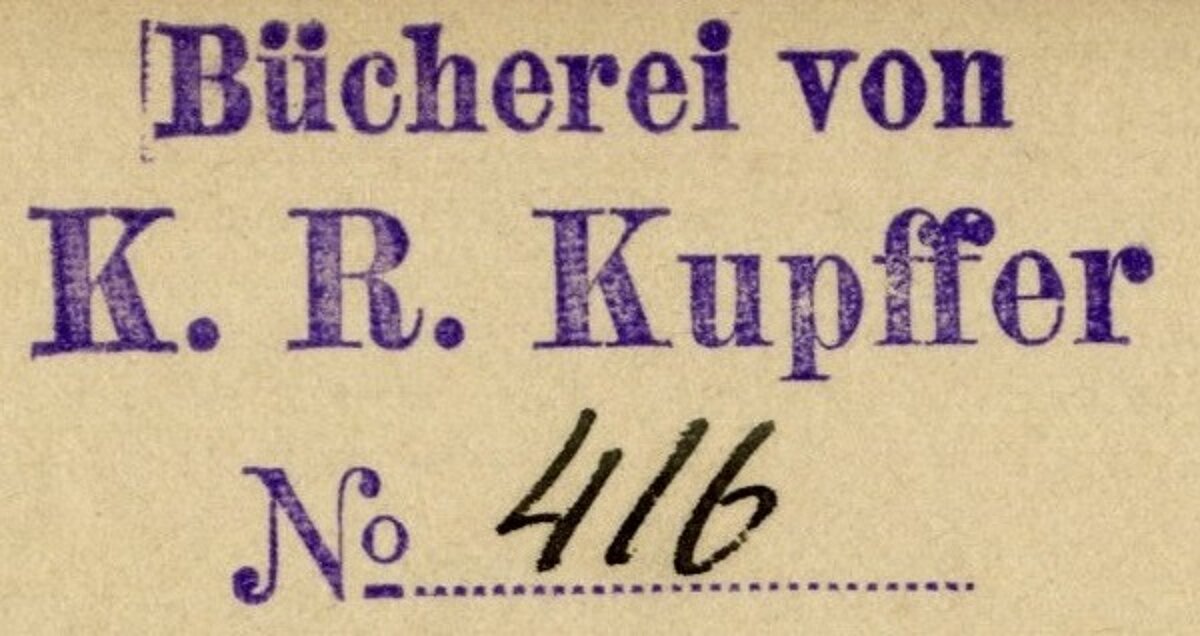 - Taisnstūra formas K. R. Kupfera privātbibliotēkas spiedogs (uzraksts vāciski - “Bucherei von K. R. Kupffer №………….”) ar tukšu vietu, kur ierakstīt bibliotēkas iespieddarba numuru;