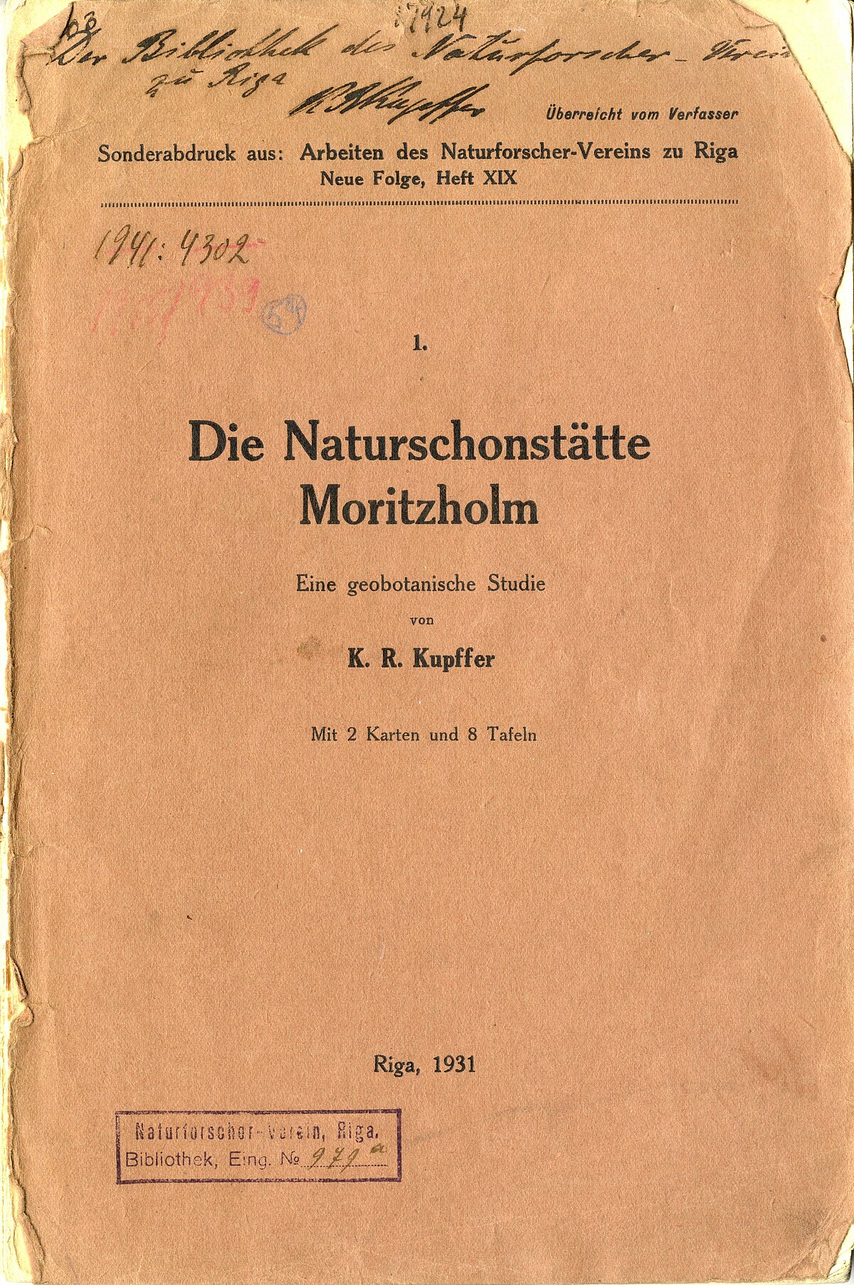 Moricsalas pirmo desmitgadu pētījumu apkopošanai K. R. Kupfers sagatavoja izdošanai grāmatu “Rezervāts Moricsalā”. Lūgumā Kultūras fondam atbalstam darba izdošanai autors min: “Minēšu vēl, ka ar savu līdzdarbību Moricsalas pētījumos mani atbalstījuši lejāk minētie zinātnieki: prof. Dr. V. Roterts Krakovā, prof. Dr. F. Bucholcs Rīgā, prof. Dr. R. Meijers Rīgā, prof. Dr. N. Malta Rīgā, konservātors F. E. Štolls Rīgā, asistents H. Skuja Rīgā, palīgasistents A. Apinis Rīgā un vēl vairāki citi.” Šeit, protams, nav minēti visi pētnieki, kas ir piedalījušies Moricsalas izpētes pirmajā posmā, kuras noslēgumu simboliski var saistīt ar grāmatas “Rezervāts Moricsalā” (“Die Naturschonstätte Moritzholm”) izdošanu 1931. gadā. Darba kopsavilkumu un tulkojumu latviešu valodā veica botāniķis Edvards Jansons (1884-1969). Darbā minētas 297 sēņu, 54 ķērpju, 123 sūnu un 404 paparžaugu un ziedaugu sugas.