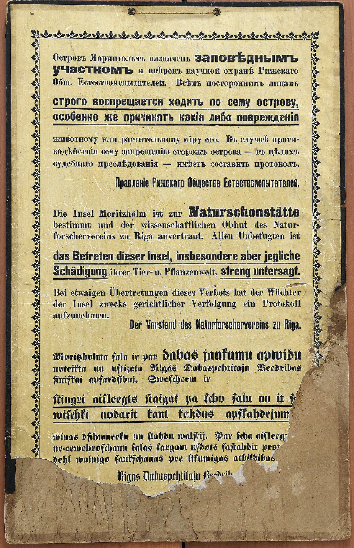 Vēsturiskā izkārtne laika gaitā ir cietus, bet uz tās joprojām ir izlasāmi uzraksti krievu, vācu un latviešu valodās. Visās valodās teksts ir vienāds, bet visvairāk cietis ir teksts latviešu valodā. Valodu izvēle uz izkārtnes gan palīdz to datēt, gan ir sava laika liecība. Tā kā Latvijas teritorija 20. gadsimta sākumā atradās Krievijas impērijas sastāvā, tad izkārtnes augšpusē redzams teksts krievu valodā. Tam seko teksts vācu valodā, kas šajā laikā bija, tā teikt, kultūras un zinātnes valoda Baltijā, arī pētnieki, kas pirmie iesaistījās Moricsalas izpētē bija vācu tautības. Arī Rīgas Dabaspētnieku biedrības (Naturforscher-Verein zu Riga; 1845 – 1939), kuras pārraudzībā sākotnēji bija Moricsalas dabas aizsardzības teritorija, darba un saziņas valoda bija vācu. Latviešu valoda, acīmredzot bija nepieciešama vietējo iedzīvotāju informēšanai, kas ziemā pār ledu un vasarā ar laivām varēja ierasties Moricsalā.