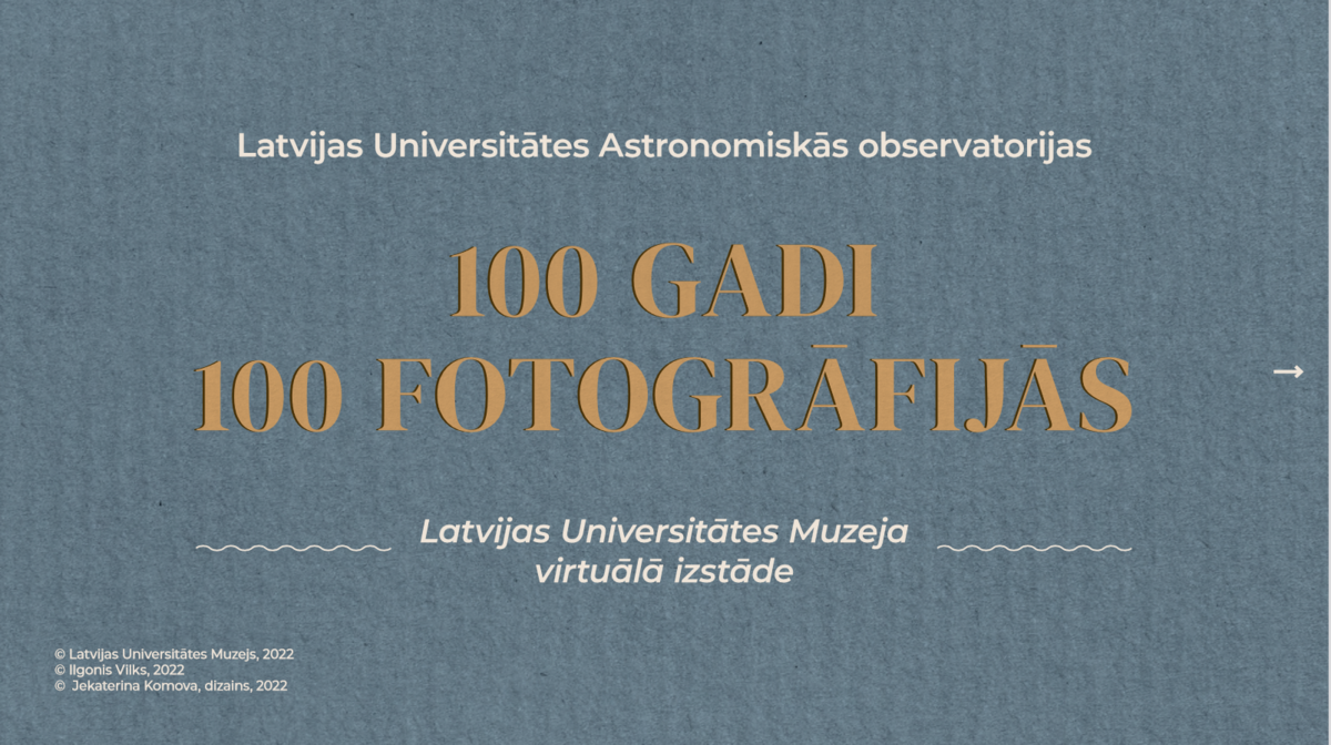 2022. gada 18. oktobrī Latvijas Universitātes (LU) Astronomiskajai observatorijai aprit 100 gadi. Par godu šim notikumam LU Muzejā izveidota virtuālā izstāde. To apskatīt iespējams ŠEIT.