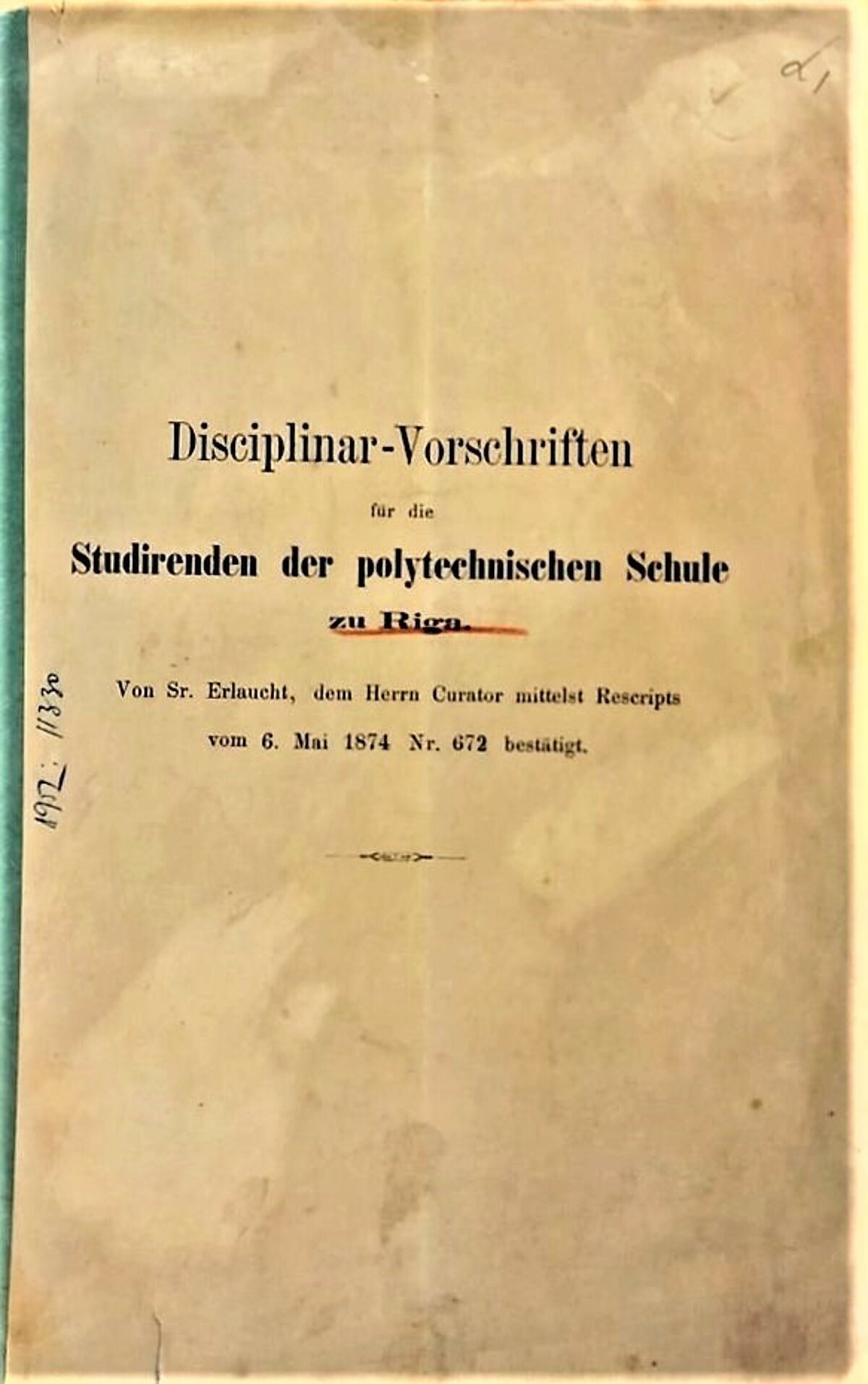 [1] LUM4120. Disciplinar-Vorschrift für die Studierenden der polytechnischen Schule zu Riga, Seite 2-3; 7