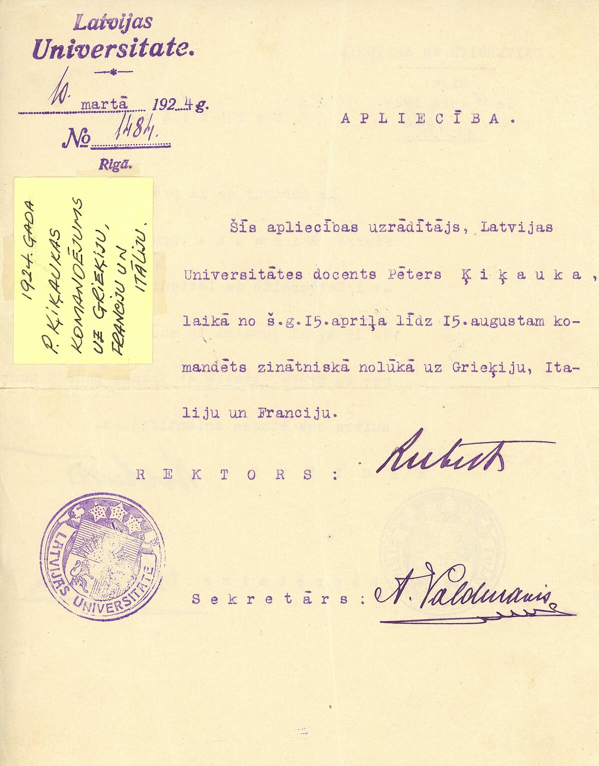 Gluži kā mūsdienās, arī starpkaru periodā universitāšu pasniedzēji devās komandējumos uz ārzemēm, lai nodarbotos ar pētniecību, iegūtu pieredzi lekciju vadīšanā vai arī pārstāvētu savu universitāti kādā oficiālā pasākumā. Pēteris Ķiķauka komandējumos uz Atēnām savas dzīves laikā devās trīs reizes: 1924., 1937. un 1939. g. Visas reizes komandējuma laikā viņš apmeklēja ne tikai Grieķiju, bet arī Itāliju un Franciju [7]. Rīkojums par došanos komandējumā 1924. g. glabājas LU Muzeja krājumā [8]. Šis komandējums norisinājās tikai piecus gadus pēc LU dibināšanas, kas sakrita ar laiku, kad LU veidojās pirmās starptautiskās sadarbības. Pētera Ķiķaukas komandējums bija viens no soļiem šo sakaru stiprināšanā. Domājams, ka nodibinātie kontakti profesoram bijuši ļoti vērtīgi, jo komandējumā devies vēl divas reizes.