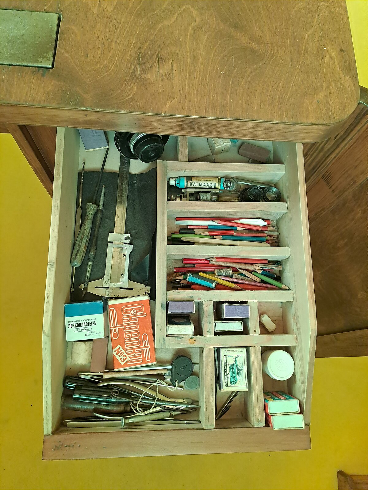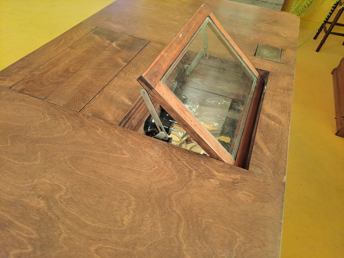 Gaismas galda stikls lietots arī kā paliktnis, domājams, papīra griešanai, tajā ir daudzi asu instrumentu – skalpeļu vai žilešu, jo tapešu nazīšus vēl nepazinām – atstāti iegriezumi.