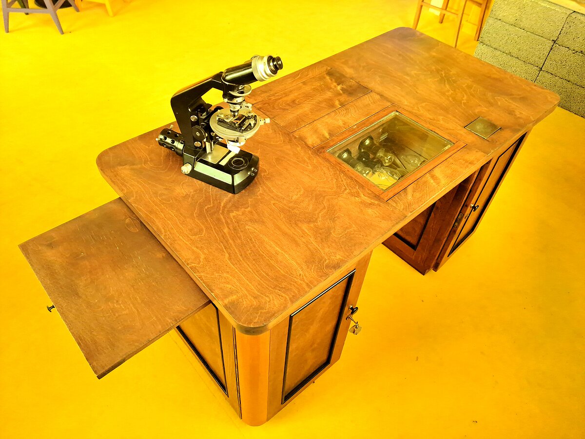 Uz galda atrodas Viktora Grāvīša lietotais polarizētās gaismas mikroskops MIN-8. Viens no V. Grāvīša interešu virzieniem bija paleontoloģija, bet viņš pārzināja arī citas ģeoloģijas – un ne tikai ģeoloģijas - jomas. Mikroskops viņam noderēja mineraloģiskos pētījumos. Par svarīgu veikumu zinātnes jomā V. Grāvītis pats uzskatīja savus pētījumus par Latvijas kramiem.