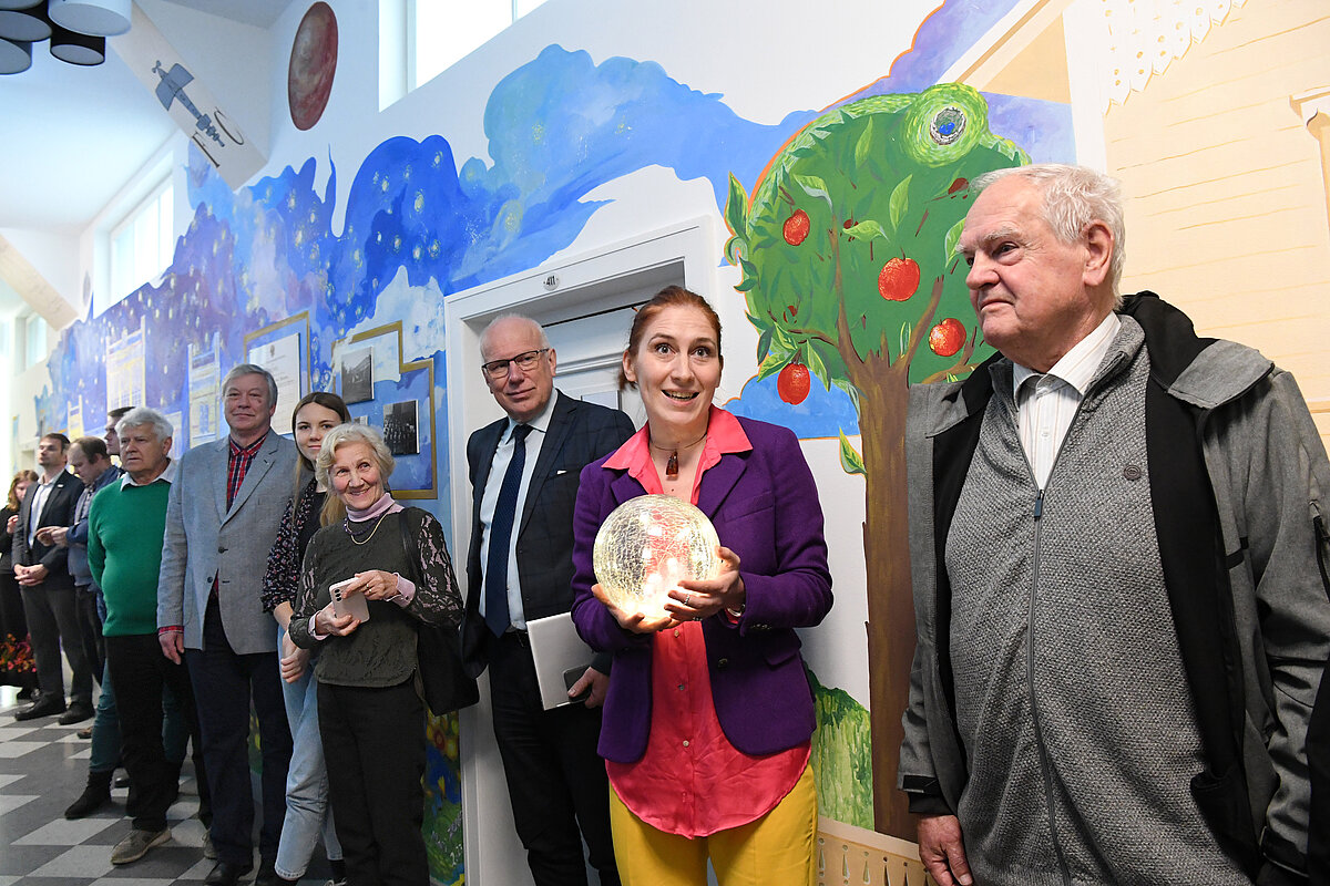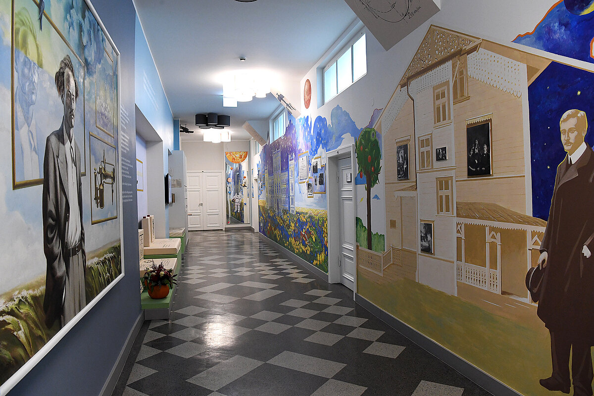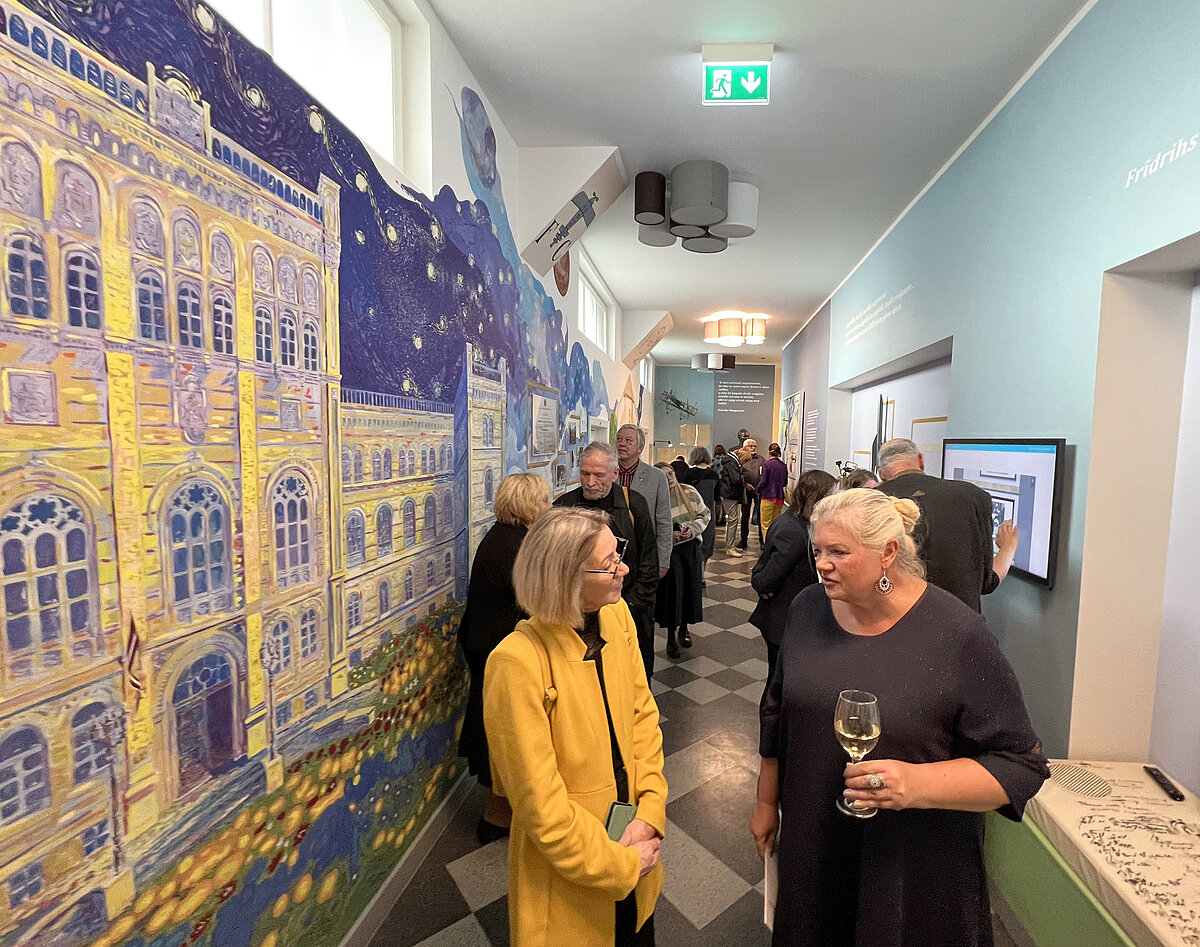 Vairāk nekā astoņus metrus garais sienas gleznojums stiepjas no grīdas līdz pat griestiem un attēlo F. Candera dzimtās mājas, kā arī Latvijas Universitātes ēku - vietu, kur studējis F. Canders, vietu, kur dzimst zinātnes sasniedzamie un tālejošie sapņi. Vairāk par F. Canderu lasāms šeit un šeit.
