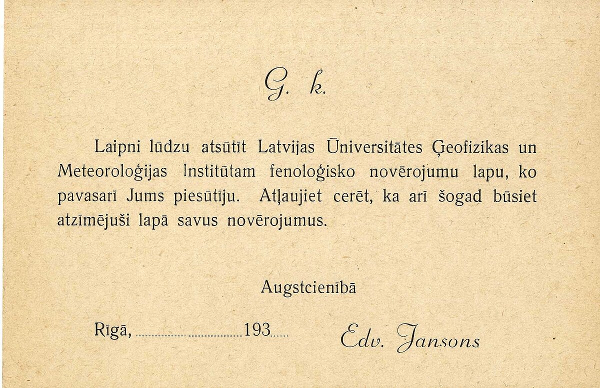 [19] Jansons Edv. Augu fenoloģiskie novērojumi Latvijā. 1927. Papildināti ar dažiem novērojumiem 1921 - 1926. - LU Meteoroloģiskā Institūta darbi. Nr.9., R., 1929.