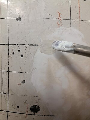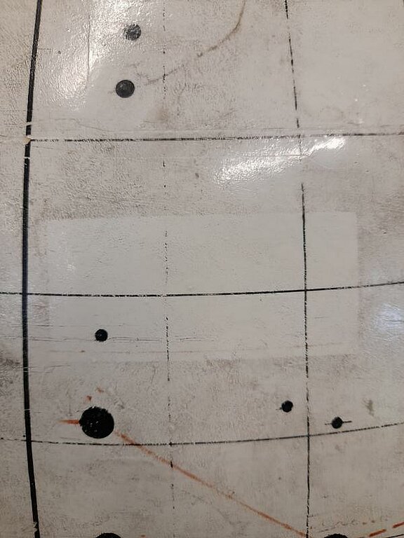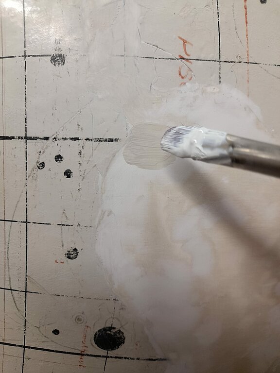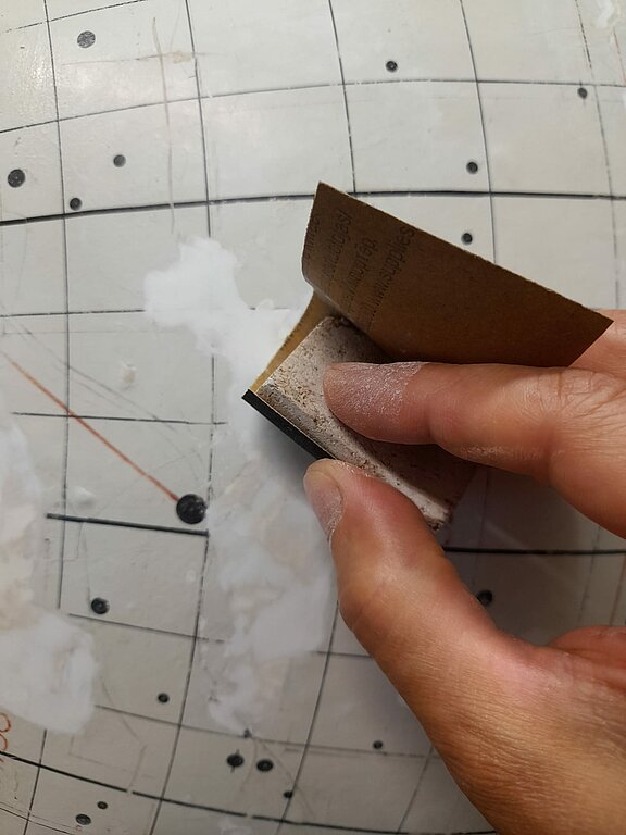 Kad pabeigts darbs ar atrasto gabaliņu pielīmēšanu, jāķeras pie pavisam tukšajiem apgabaliem, kas īpaši globusa vidus daļā, kur bija kustīgās detaļas, ir īpaši daudz. Te šobrīd jau tiek klāts pirmais grunts slānis, kam sekos rūpīga līdzināšana – lai cik akurāti krāsu neklāj, vienmēr paliek negludumi, ko pēc nožūšanas slīpē ar smalku slīppapīru. Un grunts jāklāj 4 – 5 reizes un pēc katras jāslīpē – darba te netrūkst! Nākošais solis jau būs pamatkrāsošana, kur grūtākais būs precīzā toņa atrašana.