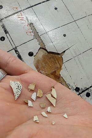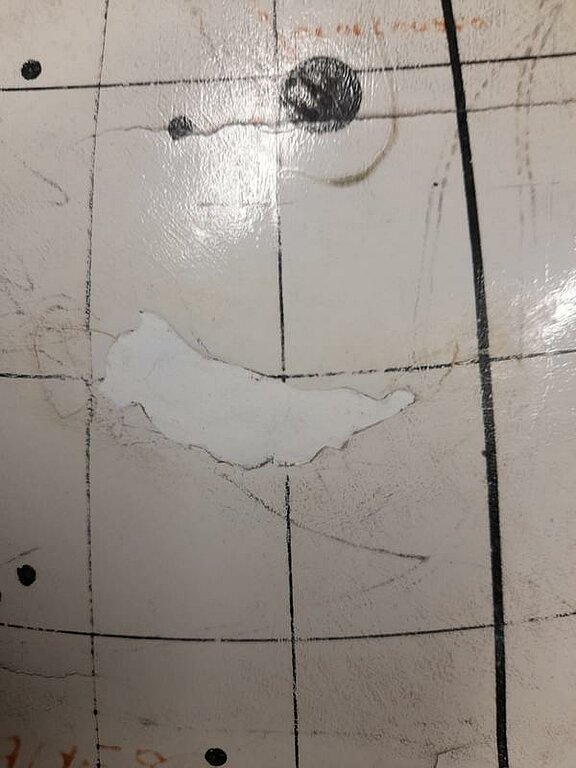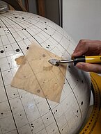 Jau vairāk kā mēnesi globusa restaurācijas darbā turpinās “puzles likšana”, jeb mazo, nodrupušo krāsas gabaliņu līmēšana savās vietās. Un nepietiek jau vien ar to, ka katram kriksītim jāatrod pareizā vieta - globuss taču nav plakans, ir jāņem vērā arī tā izliekums. Te labi noderēja speciāla bļodiņa, kas atbilda globusa apaļumam un tā bija iespējams tiešām precīzi salikt visu savās vietās.