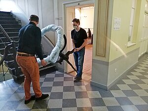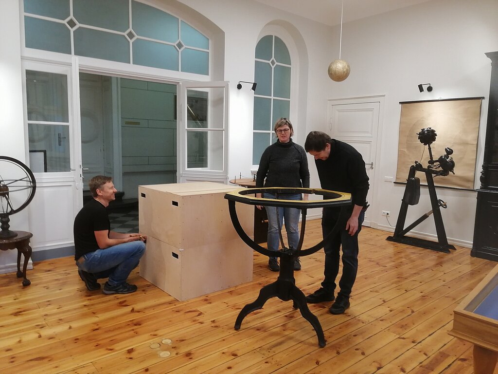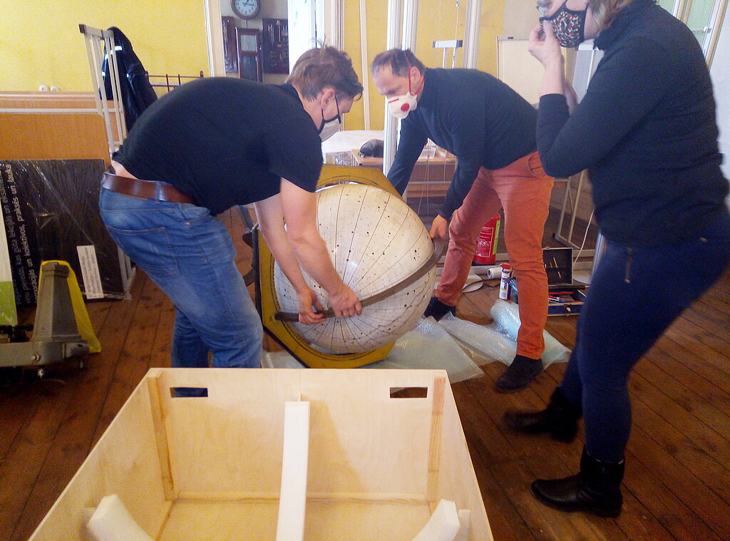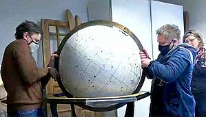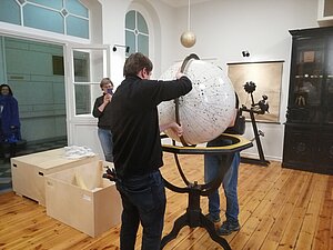 Globusa korpuss tika izsaiņots un pats globuss izcelts no speciālās kastes. Un tad restauratoriem bija jāpadomā, kā tad globuss pareizi jāliek tajā korpusā iekšā! Pirmais piegājiens izrādījās nepareizs, vajadzēja lielo, smago bumbu celt ārā, griezt otrādāk un celt atkal iekšā. Bet no viss bija pareizi, globuss griezās.