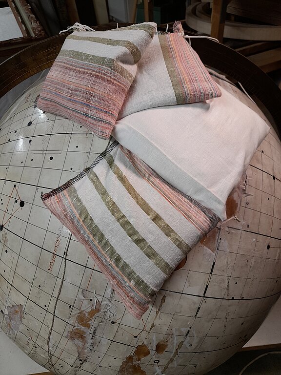 Pēc katras apstrādes – līmēšanas uz globusa virsmas tiek uzlikti slogi smilšu maisiņu veidā, kas piespiež un ļauj labi salipt un nostiprināties visam, kas darba procesā tika salabots.