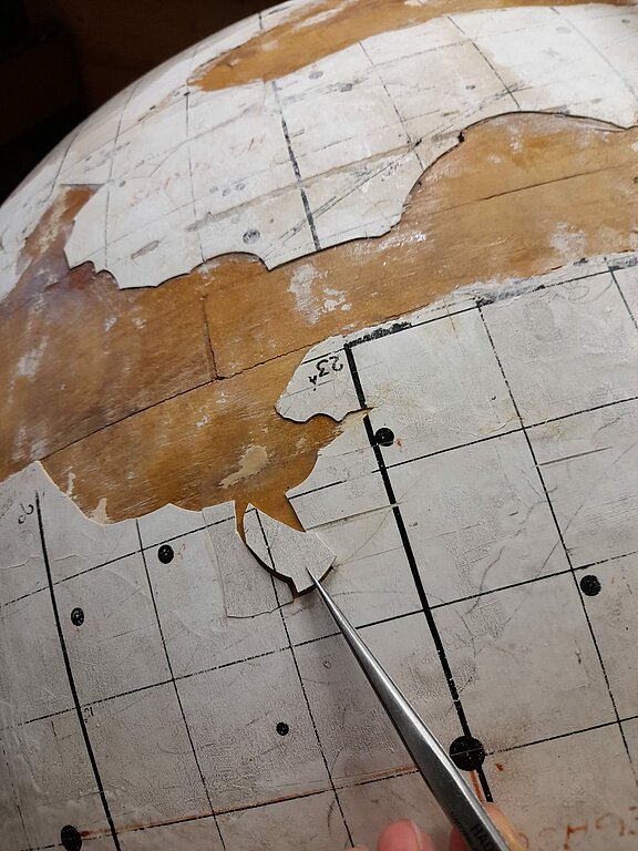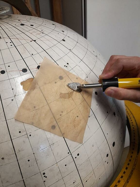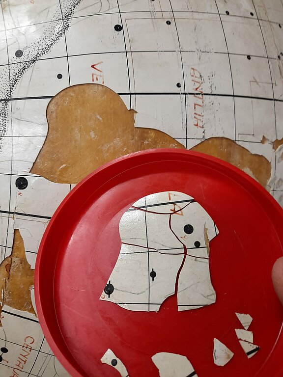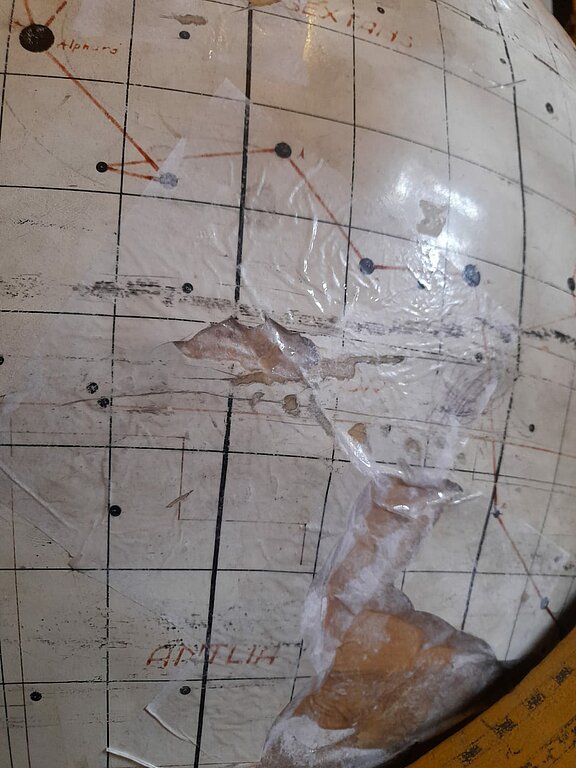 Zvaigžņu globusa pirmsrestaurācijas izpētes process ir sācies! Pirmais solis – pielīmēt atpakaļ nokritušos krāsas gabaliņus, kuriem ir zināma oriģinālā atrašanās vieta. Bet galvenais restaurātora darbs tagad būs sīki izpētīt pašu globusu - no kādiem materiāliem tas veidots, ko no tiem var atjaunot, ko nāksies mainīt. Atrast piemērotākos līdzekļus globusa notīrīšanai un restaurācijai un tā pasargāšanai nākotnē.
