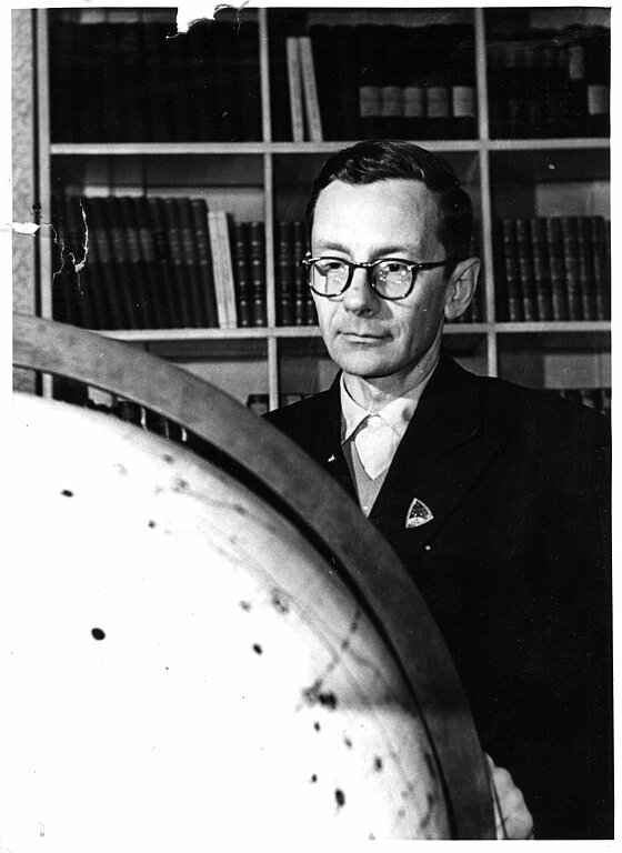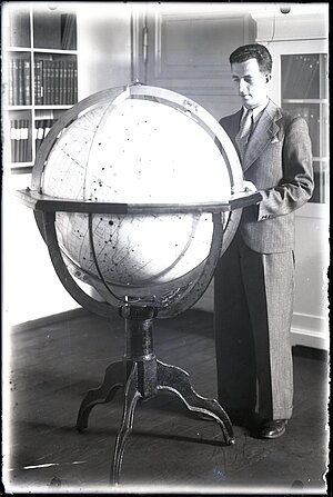 Astronomiskās observatorijas darbinieks Jēkabs Videnieks pie globusa 20. gs. 30. gados, attēls no LU Muzeja krājuma