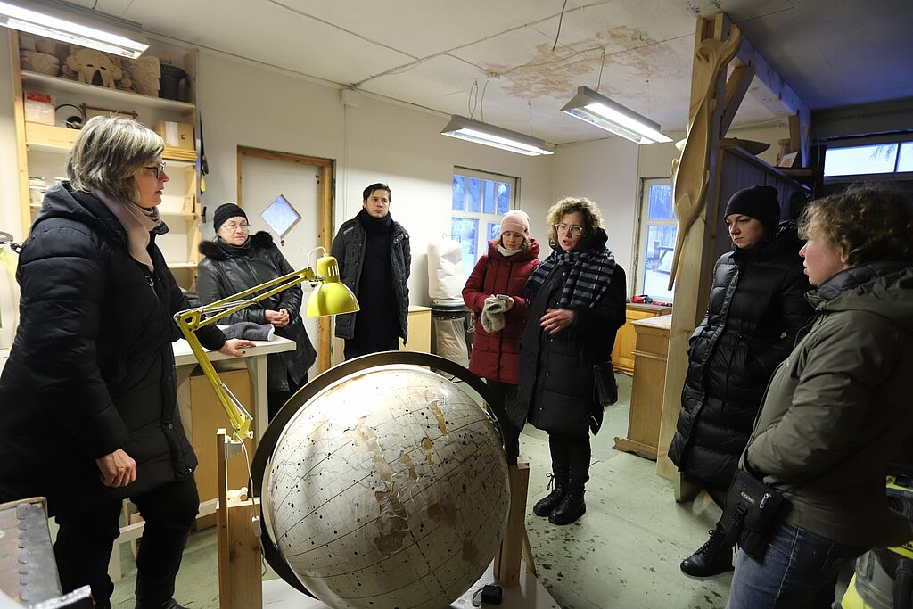 Februāra sākumā grupa restauratoru (Anna Kozorovicka, Aigars Pilenieks, Ināra Heinrihsone) un Nacionālās kultūras mantojuma pārvaldes darbinieki (Inara Bula, Ieva Jekševica, Raivis Austriņš) devas darba un interešu apmaiņas braucienā uz Mālpili. Galvenais viņu mērķis bija Mālpils baznīca, kas šobrīd tiek restaurēta, bet pirms tam visa grupa tikās restauratoru Baložu mājās. Un, protams, viņi ielūkojās arī saimieku darbnīcā, kur stāv Latvijas Universitātes zvaigžņu globuss. Tāds objekts izraisīja visas grupas profesionālo interesi un tika pētīts un spriests un runāts. Kā uztaisīts globuss? Un vai tam cauri iet metāla stienis, ap kuru globuss griežas, vai tur ir skrūvju mehānisms katrā pusē, kas ļauj debesu sfērai griezties? Un kā vispār izskatās globuss no iekšpuses? Vajag uztaisīt globusam rentgenu! Tika runāts arī par to, cik daudz nianšu var sevī slēpt vienkāršie formulējumi “virsmas tīrīšana” vai “apdares slāņa nostiprināšana”. Tika apspriestas darba problēmas - slēgtie pacēlumi, kas ir problemātiski noguldināšanai - vai durt cauri biezajam, bet ļoti trauslajam apdares slānim, lai ievadītu līmes šķīdumu? Bet to noguldinot uzreiz jūt, ka pamatne ir sarāvusies – iztaisnotās malas veido pārlaidumus. Un kā risināt šo problēmu? Kolēģi dalījās savā darba pieredzē, kaut ko ieteica un ierosināja.