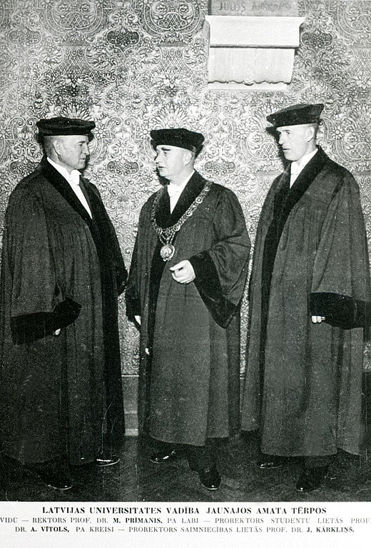 Latvijas Universitātes (turpmāk - LU) Muzeja krājumā atrodas attēls, kurā iemūžināts brīdis, kad LU vadība 1938. gada 16. novembra svinīgajā LU karoga pasniegšanas un iesvētīšanas pasākumā ierodas jaunajos amata talāros. Attēlā redzams (no kreisās uz labo) prorektors saimniecības lietās prof. Dr. Jānis Kārkliņš, prorektors studentu lietās prof. Dr. Alfrēds Vītols un tobrīdējais LU rektors prof. Dr. Mārtiņš Prīmanis. Divi oriģinālie komplekti no šiem vēsturiskajiem LU tērpu komplektiem glabājam LU Muzeja vēstures kolekcijā.