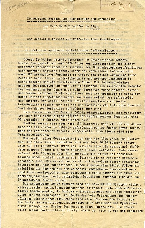 Latvijas Universitātes (LU) Muzeja Botānikas un mikoloģijas kolekciju telpās Kronvalda bulvārī 4, Rīgā atrodas vairāk kā simts gadus veci skapji, kuros šobrīd glabājas kolekcijas krājums. Atverot vienu no šiem skapjiem, tā durvju iekšpusē redzams botāniķa Karla Reinholda Kupfera (1872 – 1935) ar roku rūpīgi rakstīts herbāriju saraksts, kas saglabājies tur no laikiem, kad šie skapji vēl piederēja zinātniekam. Skapjos viņš glabāja savu lielo herbāriju un sarakstā norādīts, kas glabājies konkrētajā skapī.
