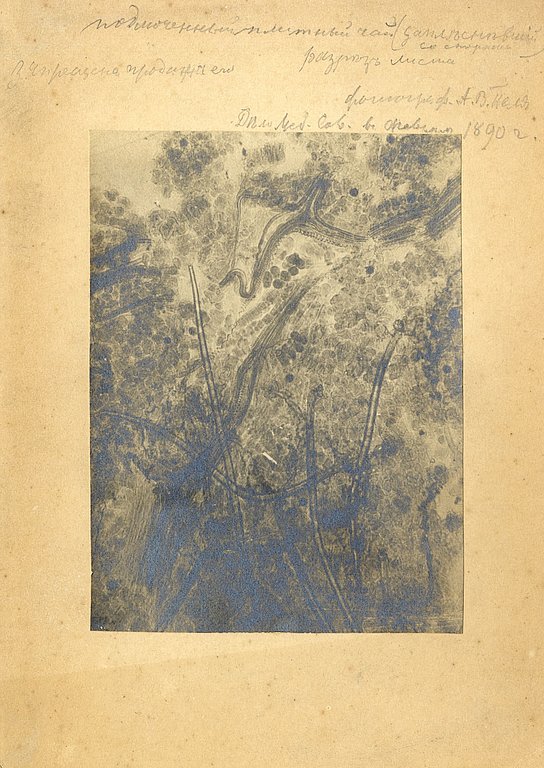 Otrā fotogrāfijā ir fiksēts lapas šķērsgriezums, kā norādīts paskaidrojuma tekstā - “samitrināta tējas lapa ar pelējuma sporām”. Šo uzņēmumu 1890. gadā veicis Pēterburgas ķīmiķis, farmaceits Aleksandrs Peļs (Александр Васильевич Пель, 1850 – 1908).