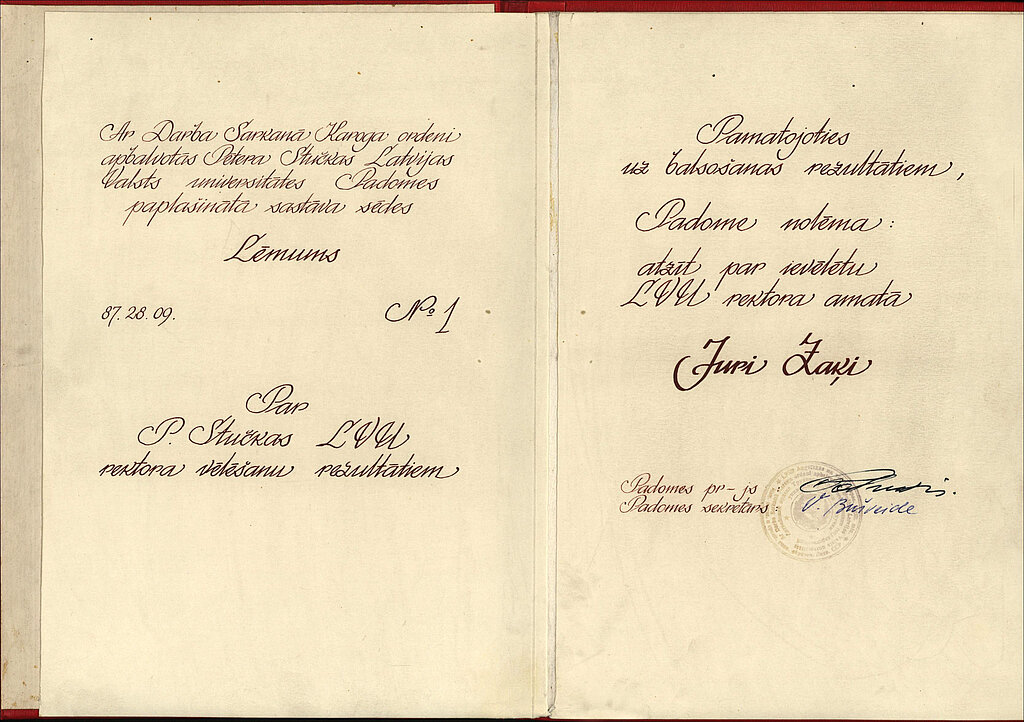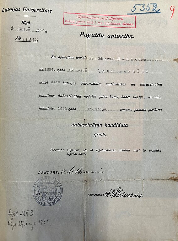 Temata saraksti godalgojamiem studentu darbiem, galvenās pārbaudes komisijas atzinumi, godalgoto darbu recenzijas, ziņas par apbalvojumiem, 1919-1939. LNA-LVVA, 7427-6-114;
